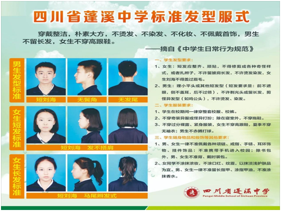 8.按照要求整理好仪容仪表。所有学生服饰、发饰必须符合中学生规则,穿戴整齐,朴素大方,头发干净整齐,不染发、不化妆、不佩戴首饰,男生不留长发,女生不穿短裙、高跟鞋等,对不符合要求的学生暂缓报名(开学后在校一律穿校服,不得擅自修改校服)。