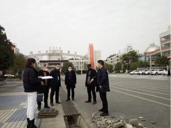 总务主任江华蓉(左一)和部分校级领导落实学校排危工作