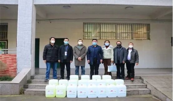 党委书记、校长胥杰(中)江华蓉(右三)等学校领导接受四川省环亚生物科技有限公司捐赠酒精、84消毒液