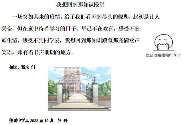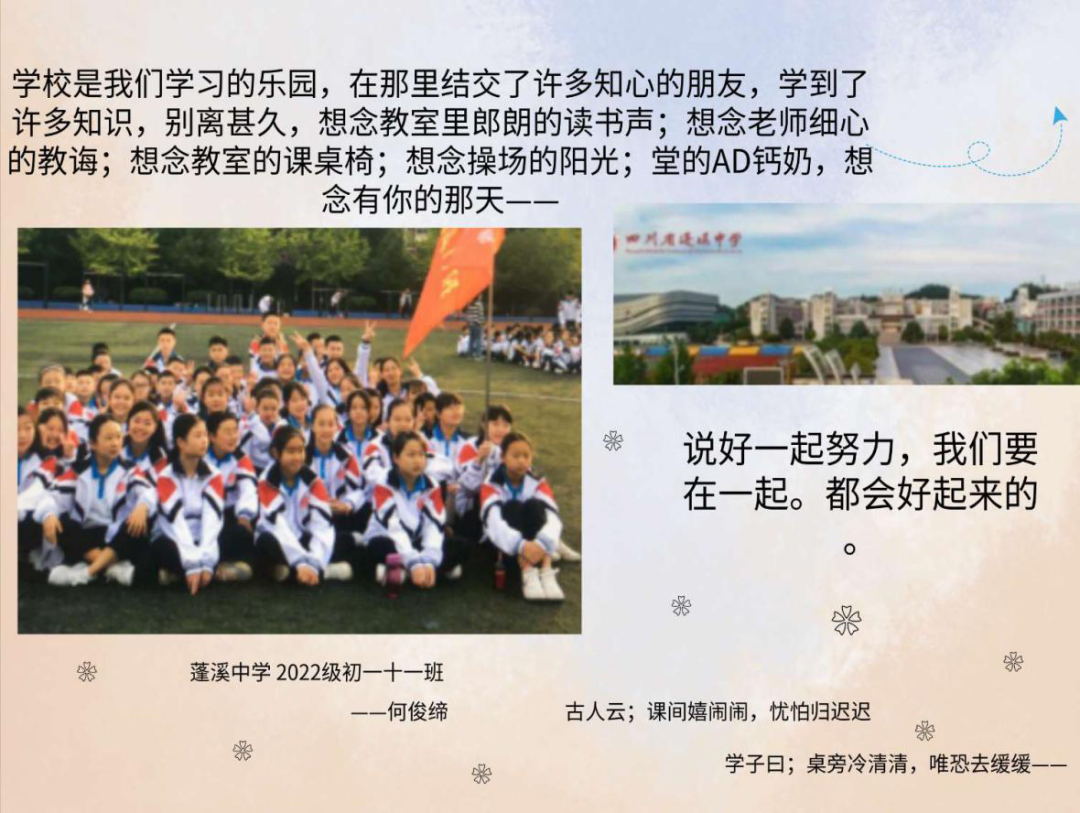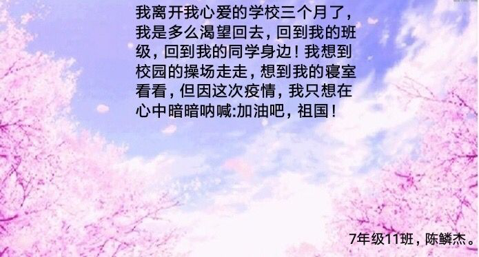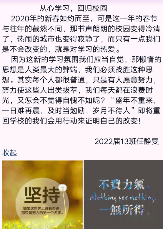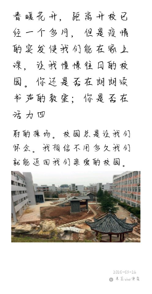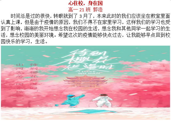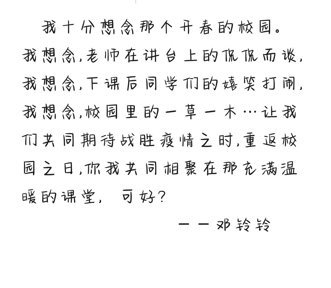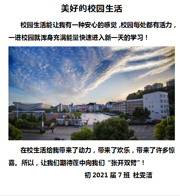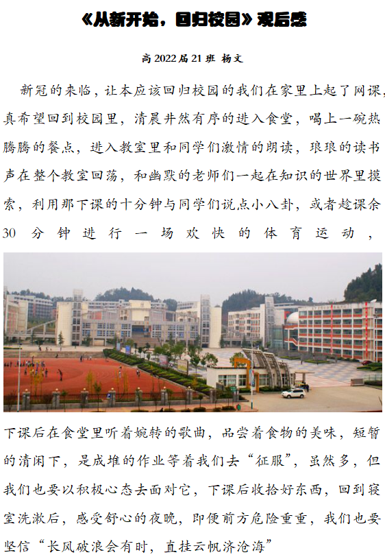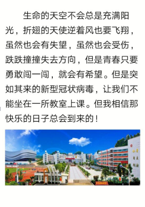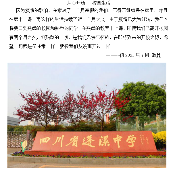 随着我国抗击疫情战斗的胜利,同学们又可以回到美丽的校园了。相信在这充满了希望的新学期里,同学们一定都能收获一份成功的喜悦。经过了一个漫长的寒假,很多同学心理上还处于放松状态,一下子要重新面对紧张的学习生活,多少会感到一些不适应。然而,新学期的学习生活即将展开,这就需要我们做出自我调整,以良好的作息习惯和饱满的精神来面对。
