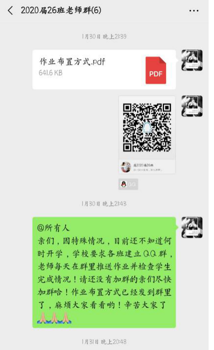 2020年的这个春节,新冠肺炎疫情一夜之间席卷了祖国的大江南北,全国人民正团结一心,全力抗击这场疫情。初2020届1班班主任刘艳老师也积极战斗在防疫第一线,除了收集本班54名学生每日行踪和身体情况并及时汇报外,还负责汇总初中年级2000多名学生的每日情况并及时上报,在疫情防控形势严峻的时刻,作为班主任和英语老师,刘艳老师更专注学生们的身心健康和学业发展:
