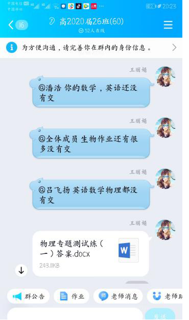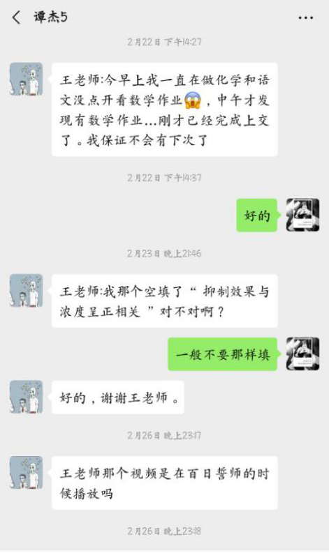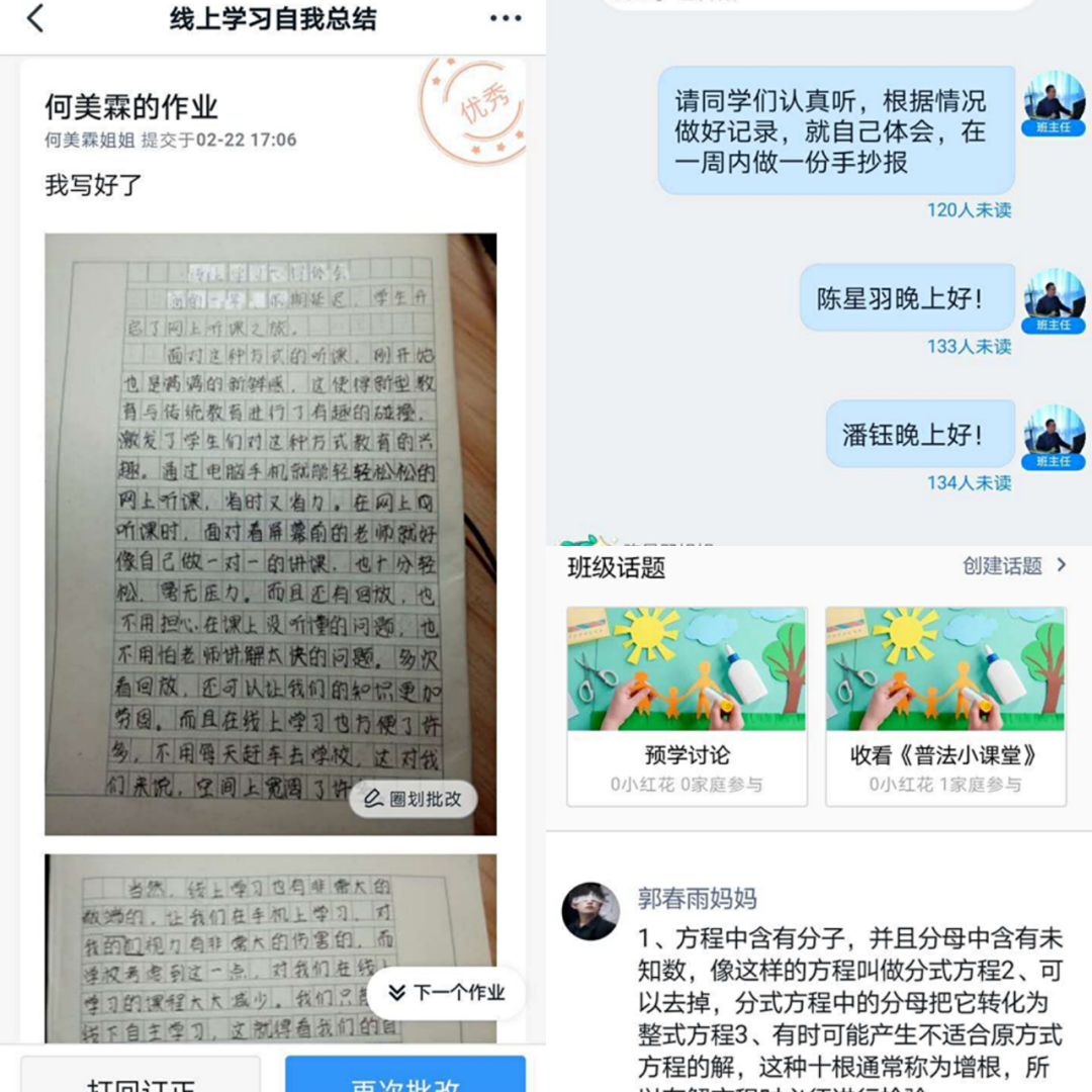 针对学生在家学习的情况,及时组建了学习小组,通过学习小组来发挥同学间的互助互促作用。坚持每天抽查学生晨读、参与直播学习,并将情况并及时做了通报,对存在的问题做了个别电话交流。课下细致批阅学生的作业,借以了解学生的学习掌握情况。抓住线上学习这个可以培养学生独立思考能力、合理规划学习的契机,通过反复对同学轮番抽检,很多同学更自律了。例如嗜睡玩游戏且顶撞家长的潘某,曾几乎不动笔的李某某,厌学的钱某某等同学都已自律多了。
