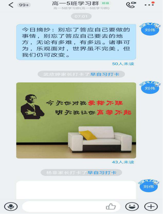 班上有一个女生,因为对直播上课有抵触情绪,学校直播上课很久之后也没有进群。刘伟老师在多次电话沟通无果后,冒着被感染的风险,驾车三十余里去到该生的家里,给该生做思想工作。该生的父母感动地说:刘老师,孩子能在你的手里学习,真是她的福气。