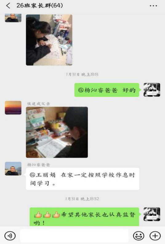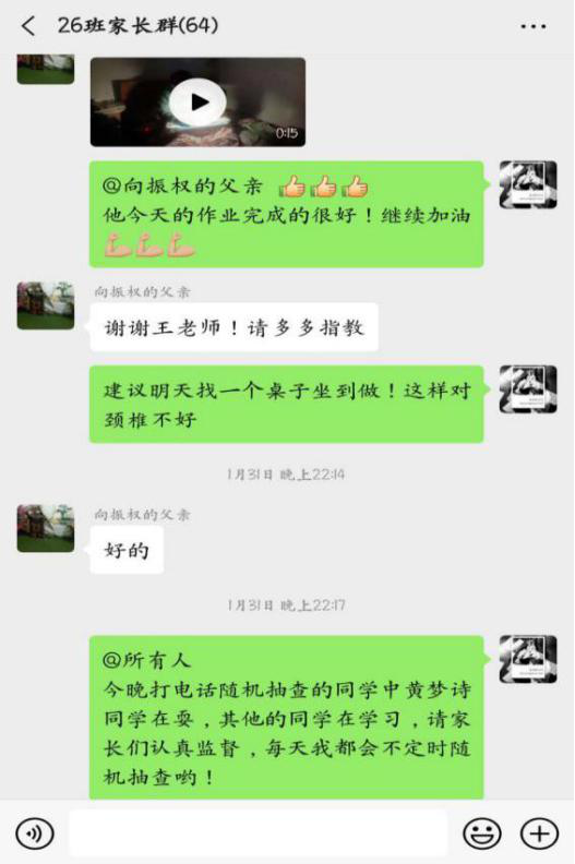 3、从1月31日正式网上开课以来,孩子们经常感叹老师起得好早呀!在王老师的带动和督促下,在家长的配合下、在任课教师的努力下,26班的孩子们表现不错,劲头很足,信心很足。