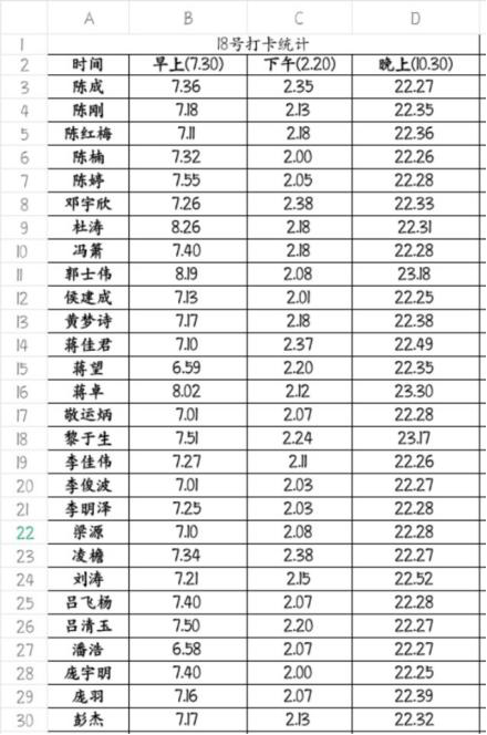 5、登记班上学生每天三次打卡的时间,统计学生作业完成情况、听课情况。对于完成较差的学生及时联系家长,通知学生,并时时关注学生的细微变化,给进步的学生鼓励。
