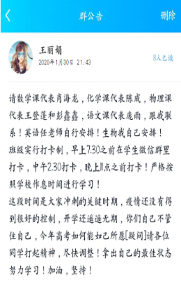非常时期,高考在即,为了高三26班的孩子们,王丽娟很早就进入了上班状态,第一时间开展了“停学不停课”活动,主要有以下几方面工作: