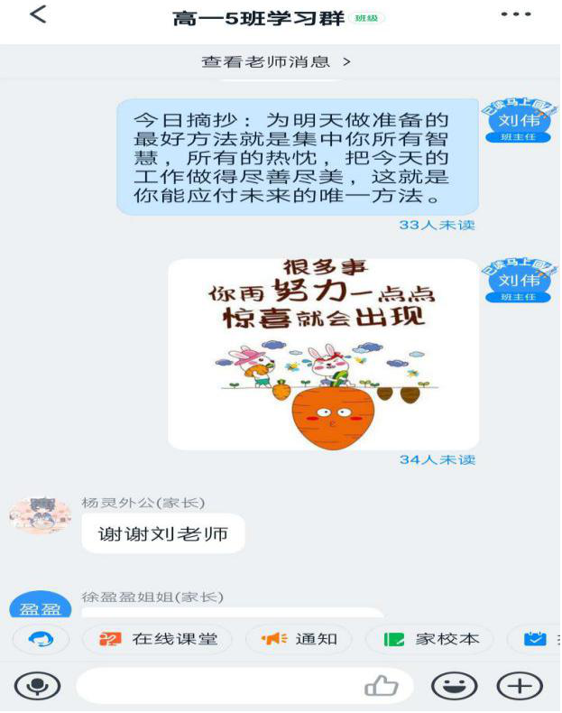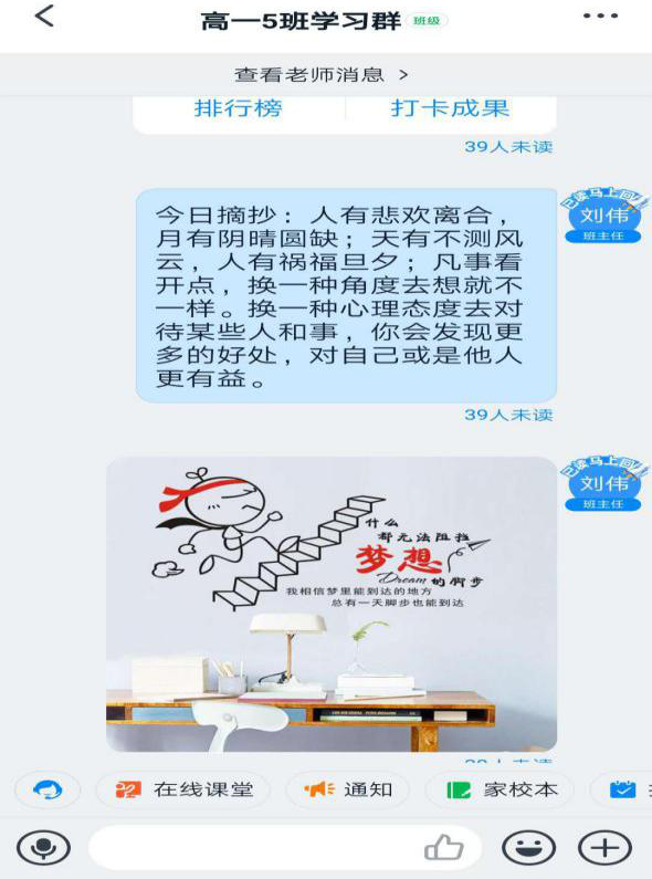 开学时间一推再推,作为火箭班的班主任,王老师心中是很着急的。从没有上过网课的他,在网上反复摸索学习,最后确定了运用钉钉平台进行上课。为保证上课的效果,王老师反复实际操作,一个问题一个问题地解决。终于在2月10日就给学生开始上网课。看着熟悉的名字,看到讨论区一声声亲切的问候、一个个的点赞,王老师感到了从未有过的欣慰。一切的付出都是值得的。第一次上完课,全班一个学生都没少,布置作业,检查作业,网上指导。就这样,王刚老师坚持每天给学生上课。有时学校的事务太多,耽误的课,王老师就利用晚上给学生上课,赢得了学生和家长的好评。每天晚上当王老师改完最后一份作业,在把成绩发给家长,一般都是11点多了,让家长非常感动。
