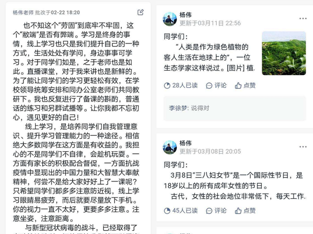 所以,作为一名科任老师和班主任,刘伟老师密切关注着学生的动向。每天他都会耐心细致地通过电话和微信等方式逐一核实学生的身体状况和活动范围,并毫不遗漏地做好记录。因为很多学生都是留守学生,父母家人都不在家,学生容易忘记上报,刘伟老师总是反复核实,一发现异常及时通过电话或微信进行核实了解。并把每天学生直播学习的情况及时在家长群和学生群进行通报,以更好的督促学生学习。除此之外,刘伟老师还不定时地在群里召开班委干部直播会议和班会,对同学们的学习情况进行了解,并对疫期可能出现的心理问题进行及时疏导。