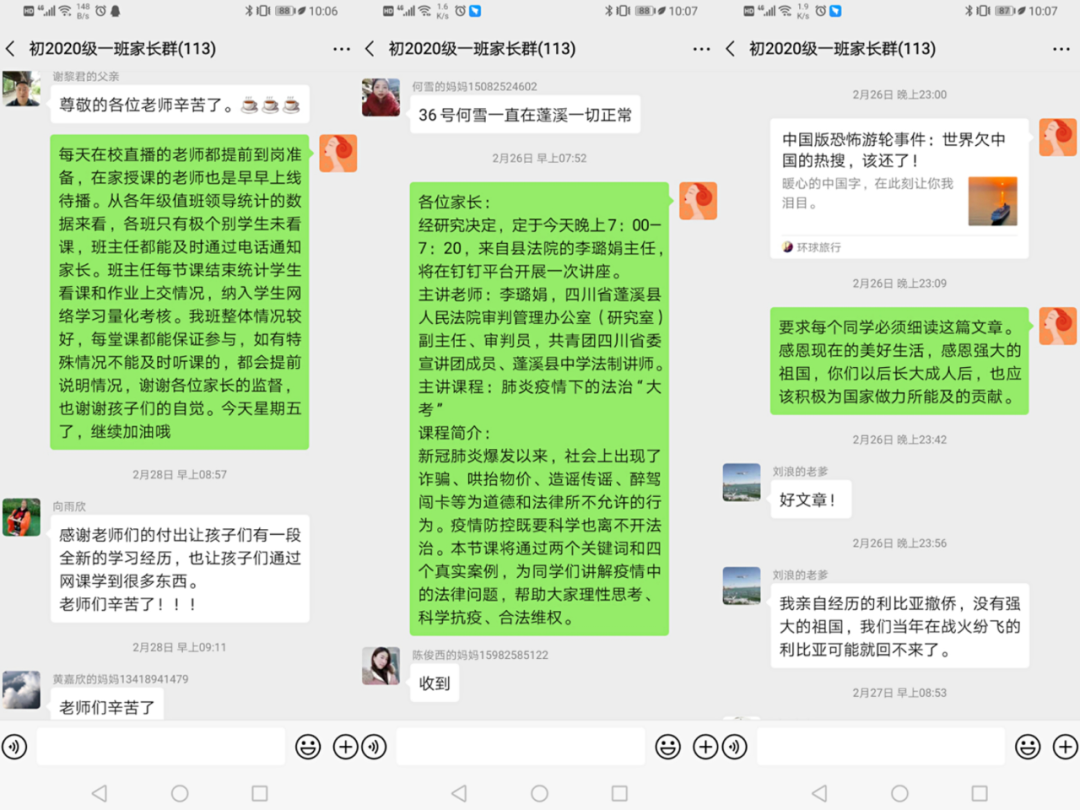刘老师非常关注疫情期间学生的心理健康问题,要求全班学生每周三晚按时收看收听学校组织的相关心理知识讲座,要求学生关注时事热点,并结合热点不时地对学生进行爱国主义教育,让学生具备社会责任感。