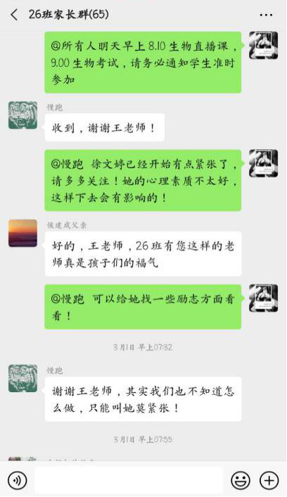作为一名毕业班的班主任,王老师以自己的方式坚守在抗击疫情的第一线,为学生的成才服好务,做到让让家长放心,社会满意!