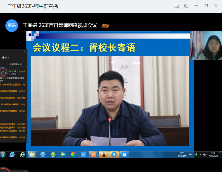 7、借助班级“百日誓师网络会议活动”,鼓舞学生士气,帮助学生强化学习目标,提高学生学习积极性,受到了老师和家长的一致好评。