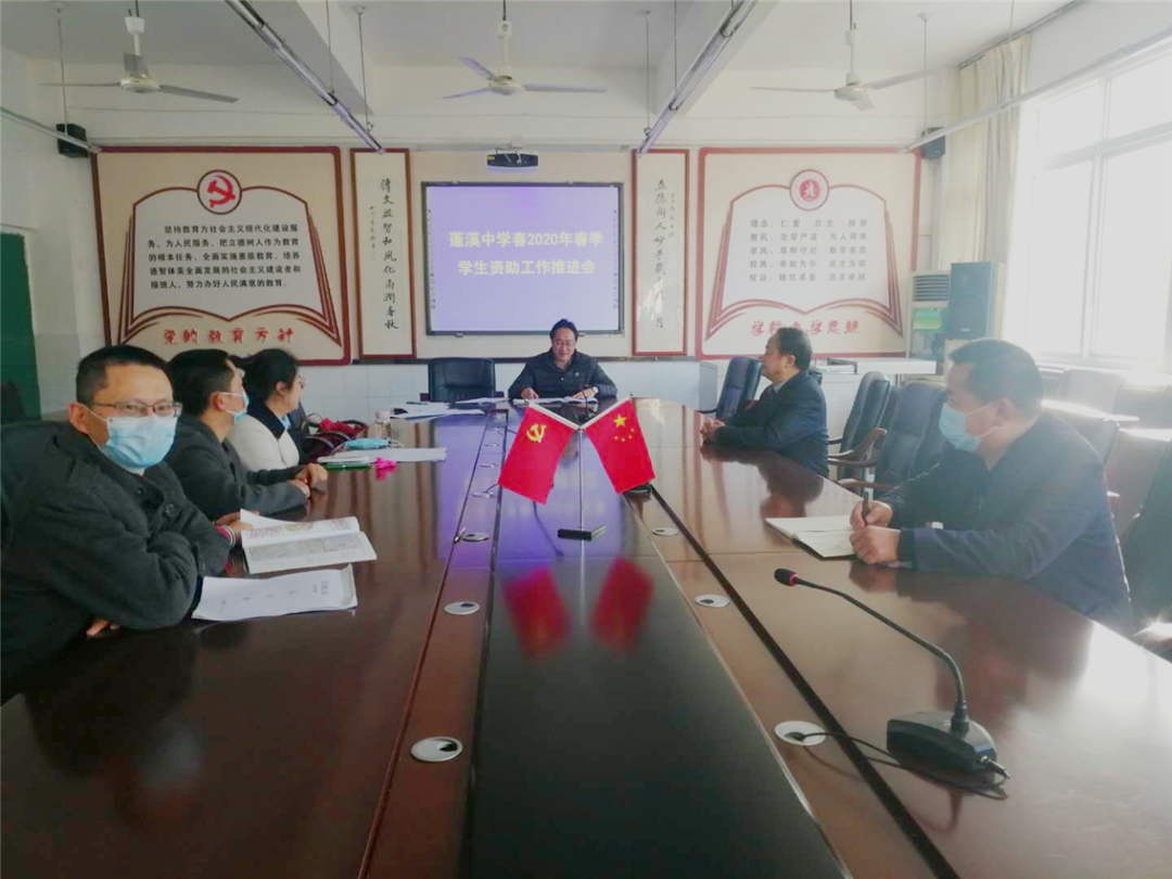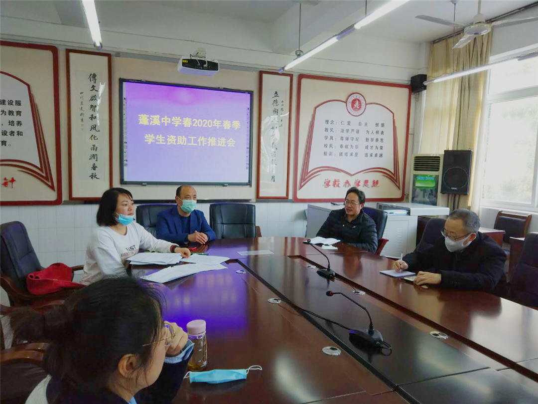 蓬溪中学政教处组织各年级资助工作人员召开2020年春季资助工作推进会议。政教处主任文宏宇组织本次会议,高中各年级助理、政教处工作人员参加,政教处副主任刘艳传达了《2020年全县学生资助工作要点》《落实2020年春季建档立卡贫困家庭学生资助政策的通知》要求各年级继续落实建档立卡学生的信息核查,针对部分学生动态调整,需要班主任和家长进一步核实,确保所有信息准备,确保每一位建档立卡学生都能享受到国家的资助政策。杨加林书记也特别强调,要求切实抓好资助工作,帮助需要帮助的人,为学生做好事,办实事。