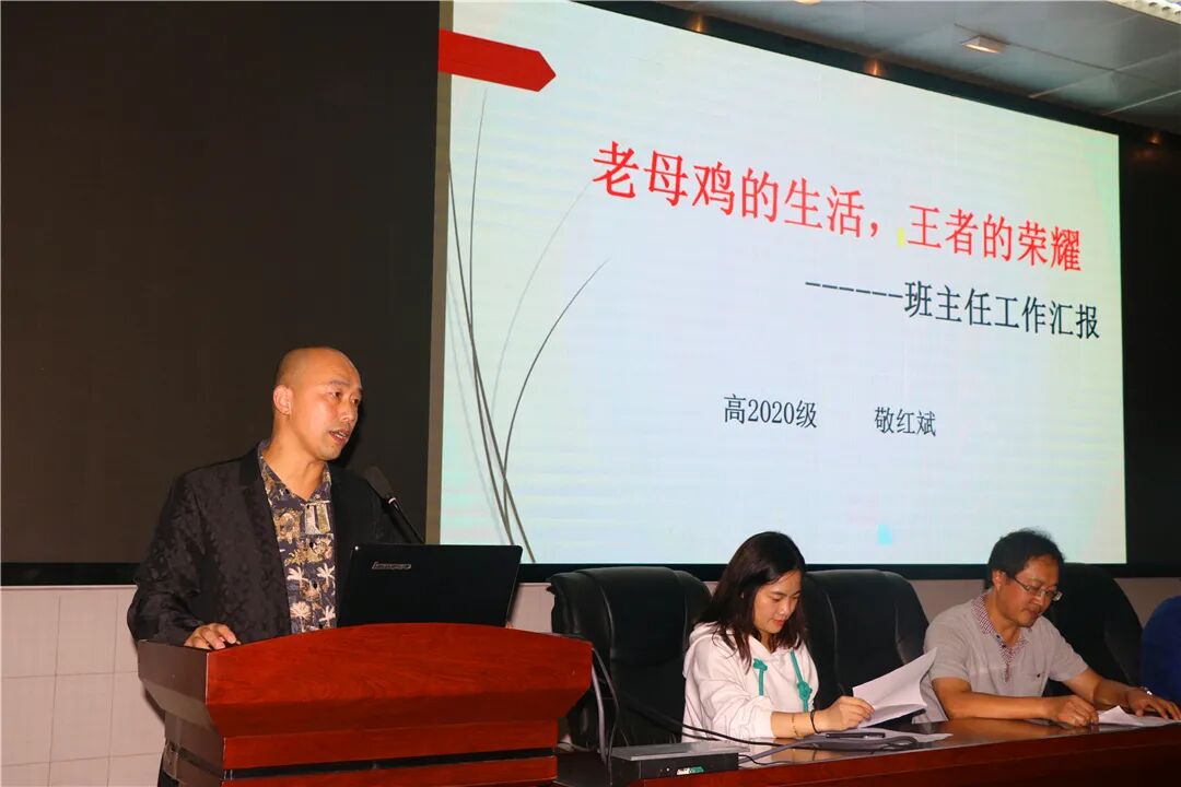 会议第二项由班主任代表敬红斌老师发言。敬老师以《老母鸡的生活,王者的荣耀》为题作了交流发言。他说班主任要像老母鸡那样保护学生,教会学生成长,最后就能获得王者的荣耀。他从组建班级,做好家校沟通,注重细节管理,用心用情用智管理学生,教师要宣传正能量等七个方面做了交流发言。