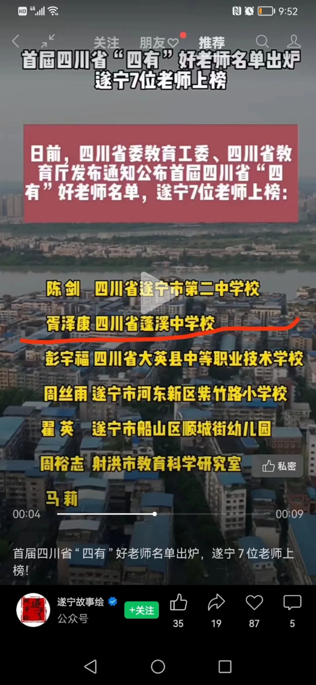 祝贺蓬溪中学胥泽康老师获首届四川省“四有”好老师称号