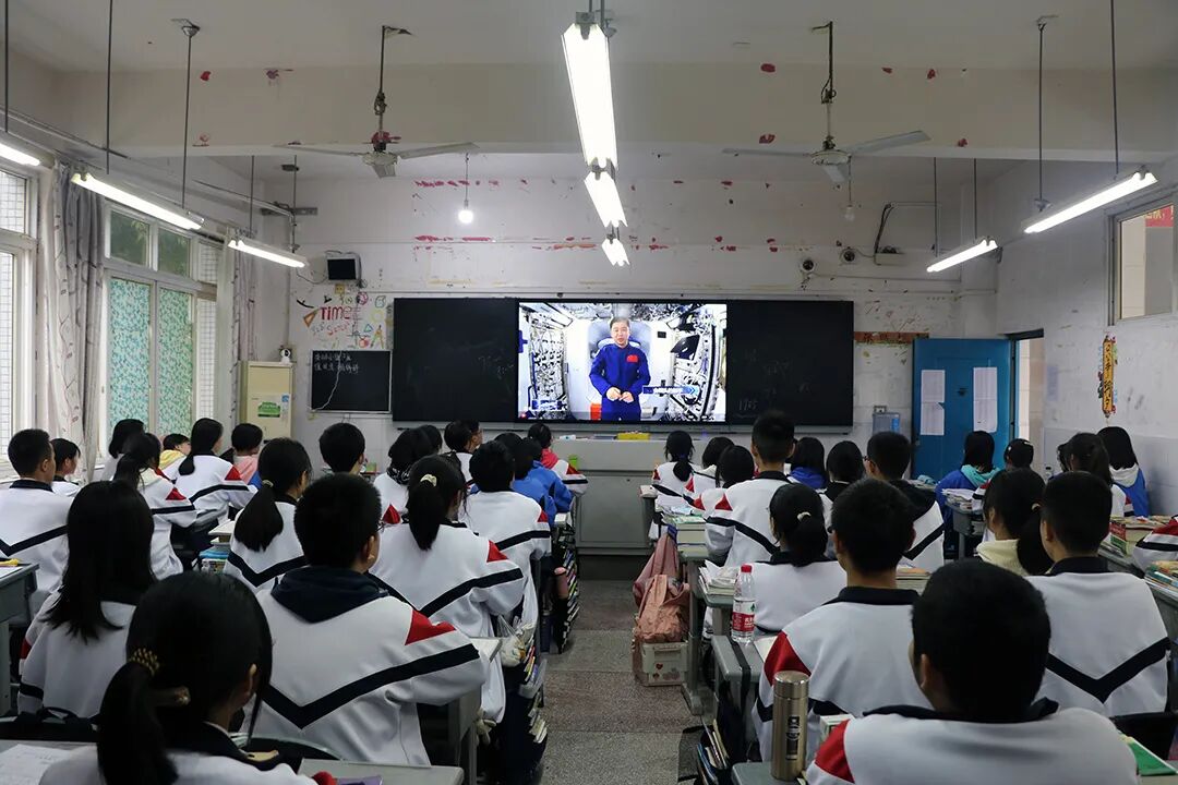 此次来自400多公里外的太空授课,神舟十四号飞行乘组航天员陈冬、刘洋、蔡旭哲演示了微重力环境下毛细效应实验、水球变"懒"实验、太空趣味饮水和会调头的扳手等有趣的实验。为了让学生们感知到科学的魅力,学校抓住这次难得的学习机会,精心谋划,提前调试多媒体设备,保障看课条件,任课教师陪同学生一起观看了直播。