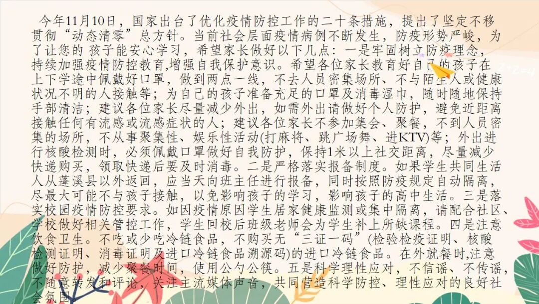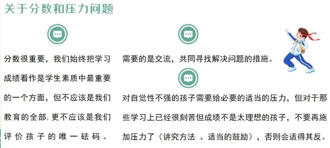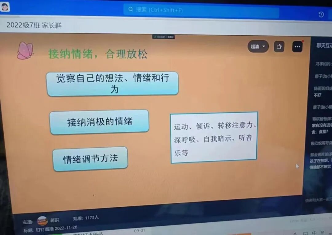 会议伊始,蒋洪主任介绍了学校的办学思路和年级的管理情况,介绍了高一年级2022年工作的思路:“严管理,提质量,创业绩,树形象。”同时还着重强调了疫情防控和安全教育问题,呼吁所有家长朋友配合学校工作,促进家校社共育。最后针对学生出现的问题,建议家长从5个方面给予孩子正确的教育和引导:(2)在教育上讲究方式方法,态度不能粗暴,言语不能过激。