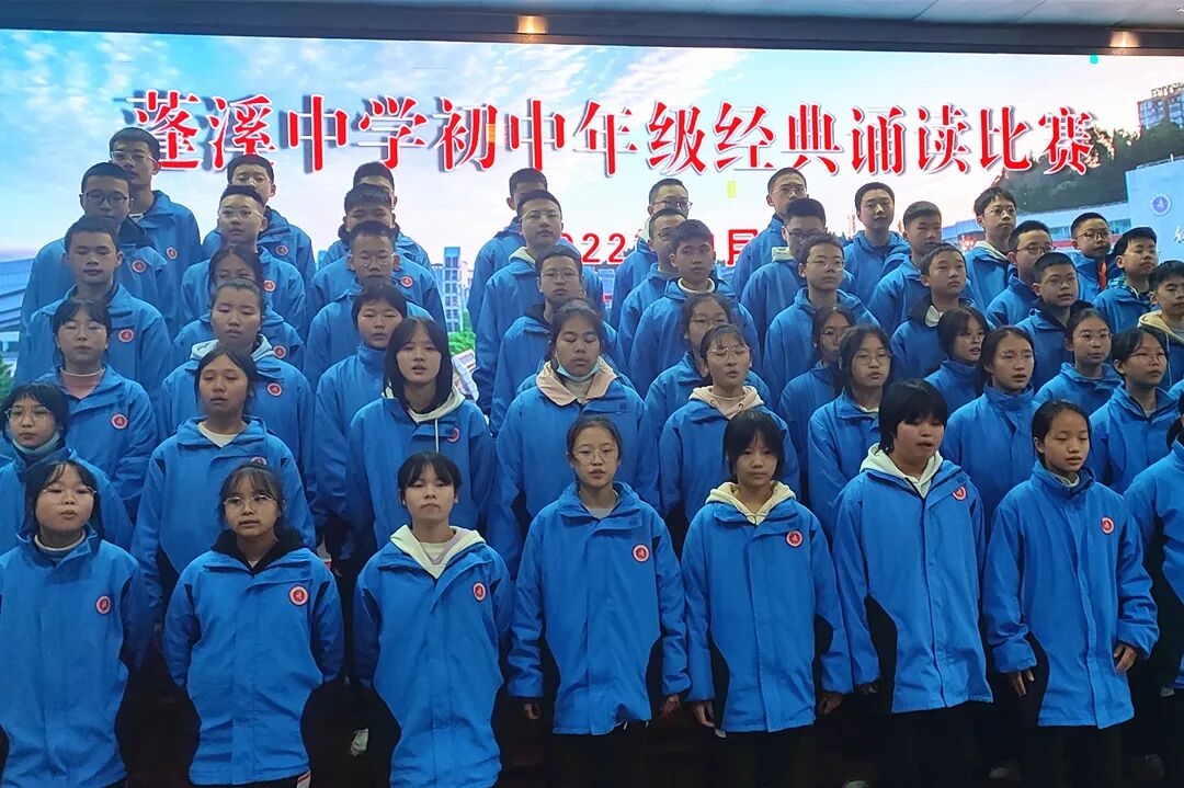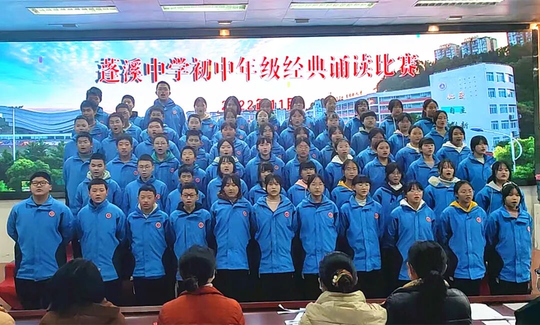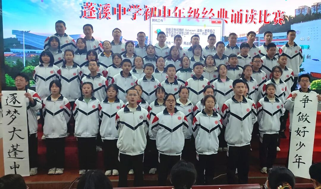 蓬溪中学通过在学生中开展经典诵读比赛,通过诵读、熟背经典、美文、唐宋诗词,以达到文化熏陶、智能锻炼与人格培养的目的。各班积极准备,最后初二2班、初二3班、初三4班、初三1班、初三3班获一等奖。