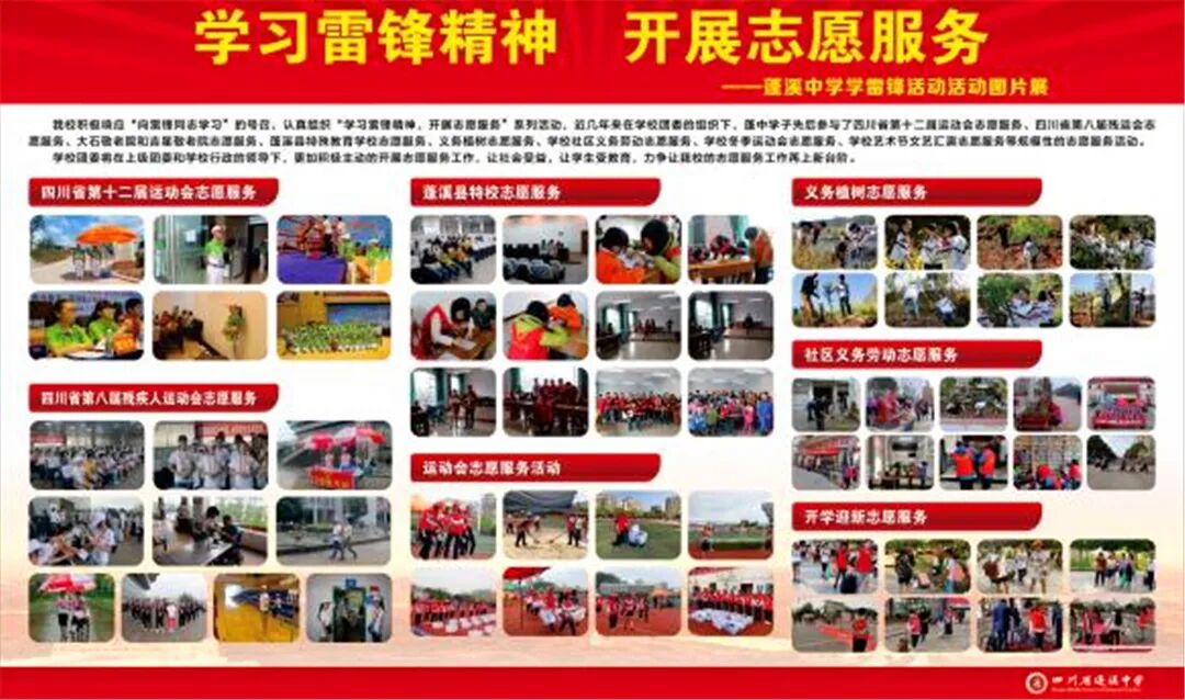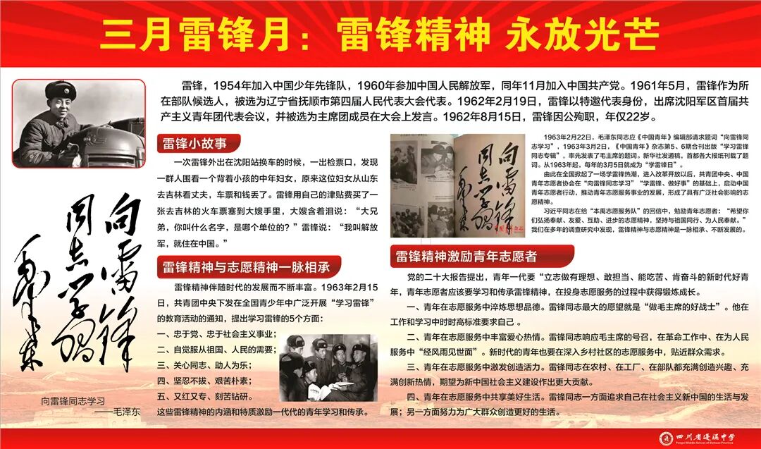 今年是毛泽东等老一辈革命家为雷锋同志题词60周年。为进一步贯彻落实习近平总书记对深入开展学雷锋活动的重要指示,弘扬雷锋精神,促进学雷锋活动常态化。2023年3月,四川省蓬溪中学校组织开展“学习雷锋精神,开展志愿服务”等一系列活动。