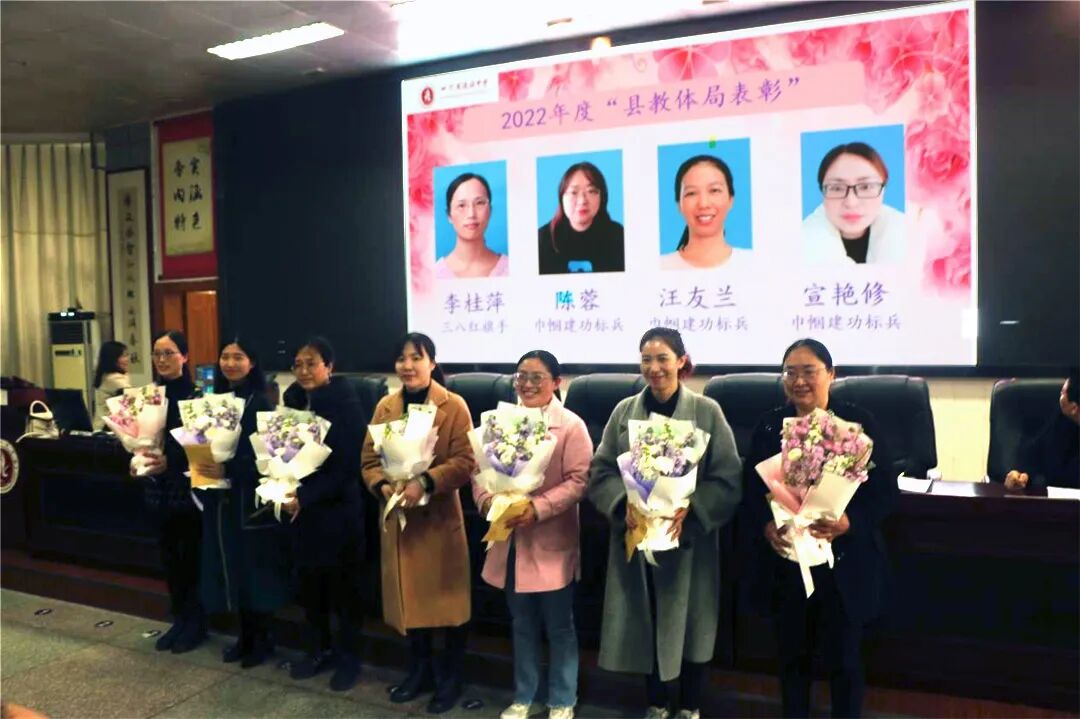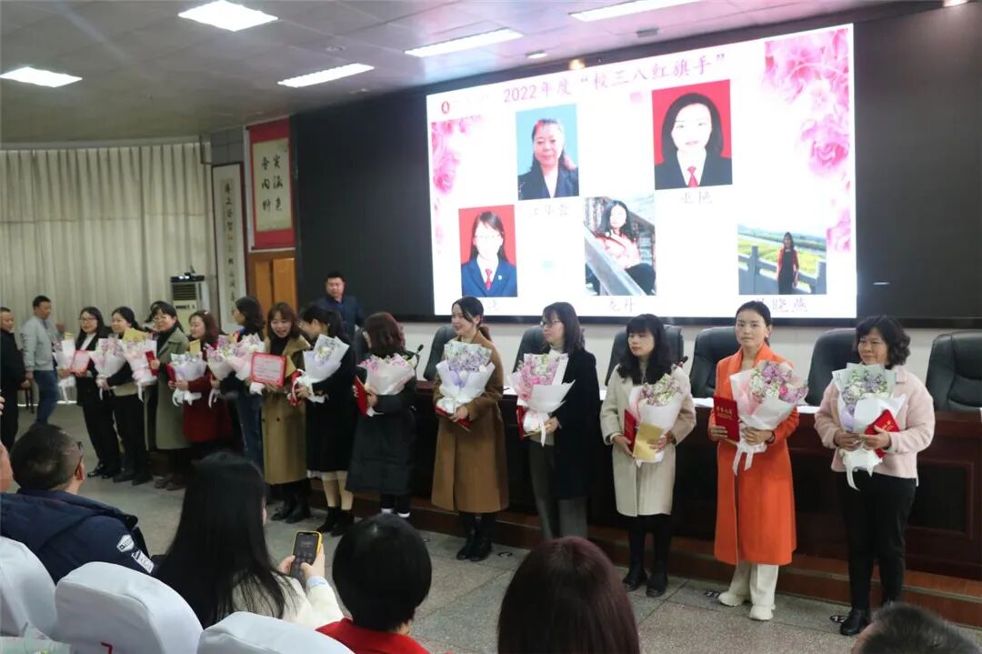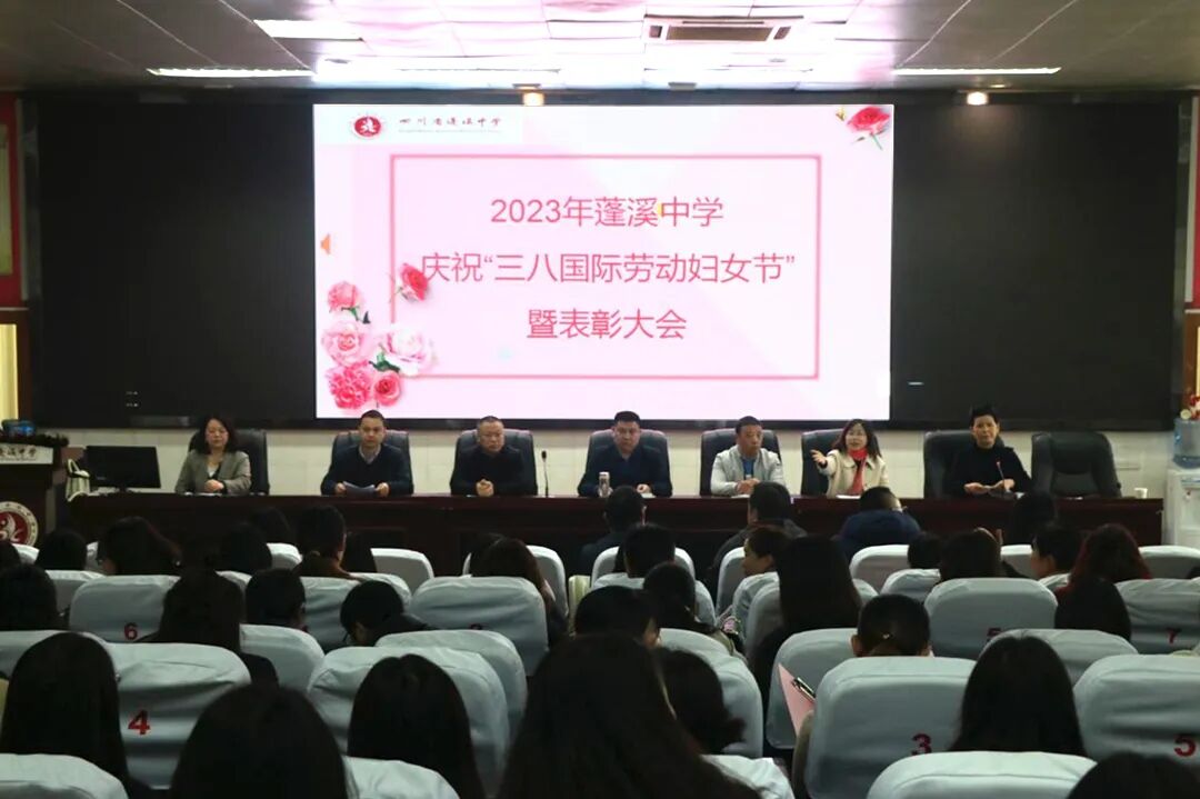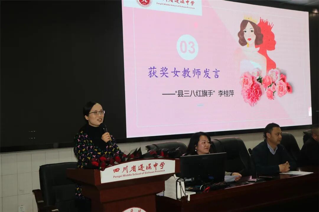 下午两点四十,在学术报告厅举行了三八国际妇女节庆祝活动及表彰大会。工会副主席刘莉老师主持会议,蓬溪中学党委副书记冯春梅宣读表彰文件:蓬溪中学妇委会获市妇联“三八红旗集体”荣誉称号,李桂萍老师获县教体局表彰的“三八红旗手”称号,张兰,黄秀兰,陈凤梅,宣艳修,汪友兰, 陈 蓉(政)等老师获县教体局表彰的“巾帼建功标兵”称号,陈春艳等13名老师获学校表彰的“三八红旗手”称号,冯应芬等13名老师获学校表彰的“巾帼建功标兵”称号。校级领导为以上获奖女教师颁发证书、奖杯并献上鲜花。李桂萍老师作为获奖女教师代表发言,学生代表何柯利也深情地表达了对教师妈妈以及全校女教师们的祝福。妇委会刘艳主任从坚定理想信念、提高政治站位,开拓创新、扎实搞好妇女工作,关爱女生、积极开展女生教育等三个方面总结了一年的工作。
