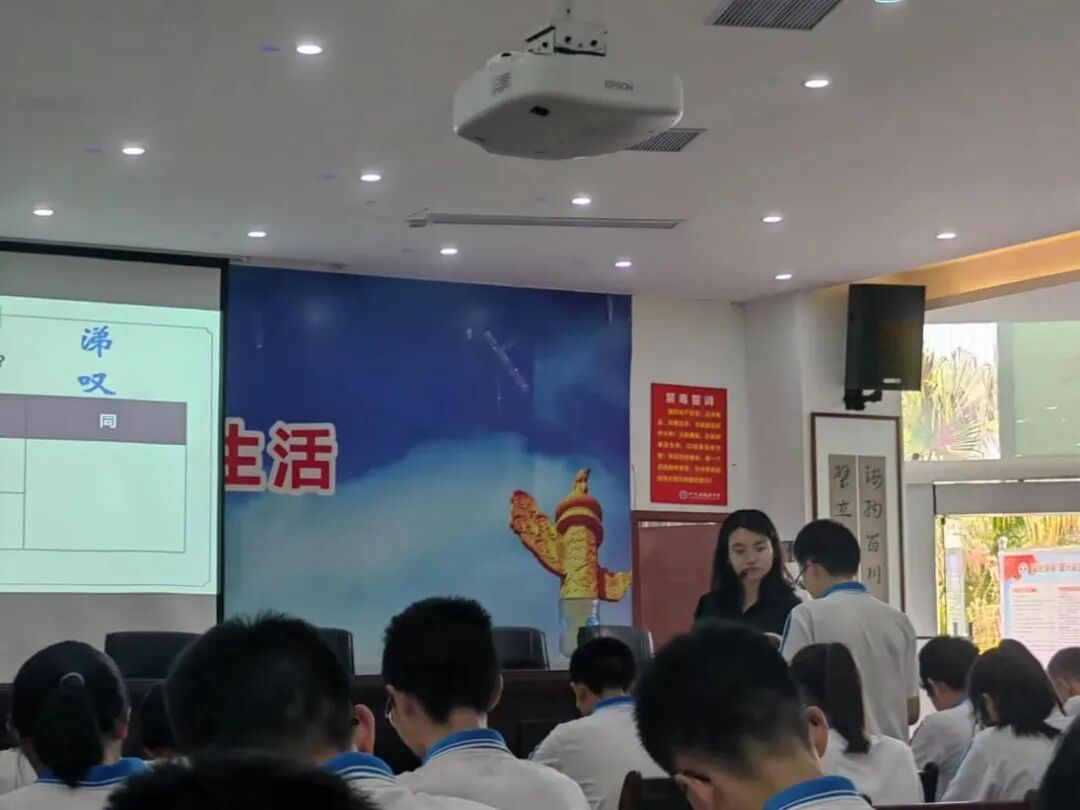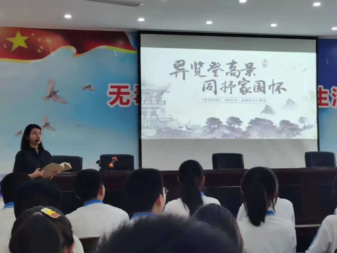 蓬溪中学高一年级谢海霞老师首先进行了题为“异览登高景,同抒家国怀——《登岳阳楼》《桂枝香·金陵怀古》联读”的公开示范课。围绕“审美鉴赏与创造”这个语文学科核心素养,采用“任务群”学习的语文学科典型学习方式,在“导学进程”中设置“情境任务”:学校文学社将开展“异览登高景,同抒家国怀”的诗词研讨会,引领我们感受文学作品中登高赋远的魅力。随后通过已学的《观沧海》《望岳》两首诗探寻出登临诗的一般创作思路:一、登临何时何地?二、目见何景何物?三、生发何感何怀?四、何事感斯怀?在“学习进程”中根据登临诗创作思路设置安排了四项任务,通过多类型朗读、任务驱动的方式带领同学们共同品鉴了登临诗的魅力,感受了诗人的家国情怀,谢老师与学生互动频频,语言简洁,循循善诱,充分调动了学生参与课堂的积极性,给我们展示了一个充满活力又高效的课堂。