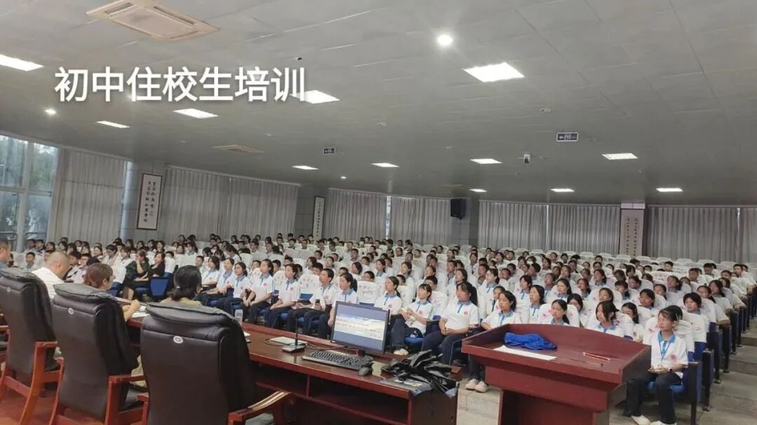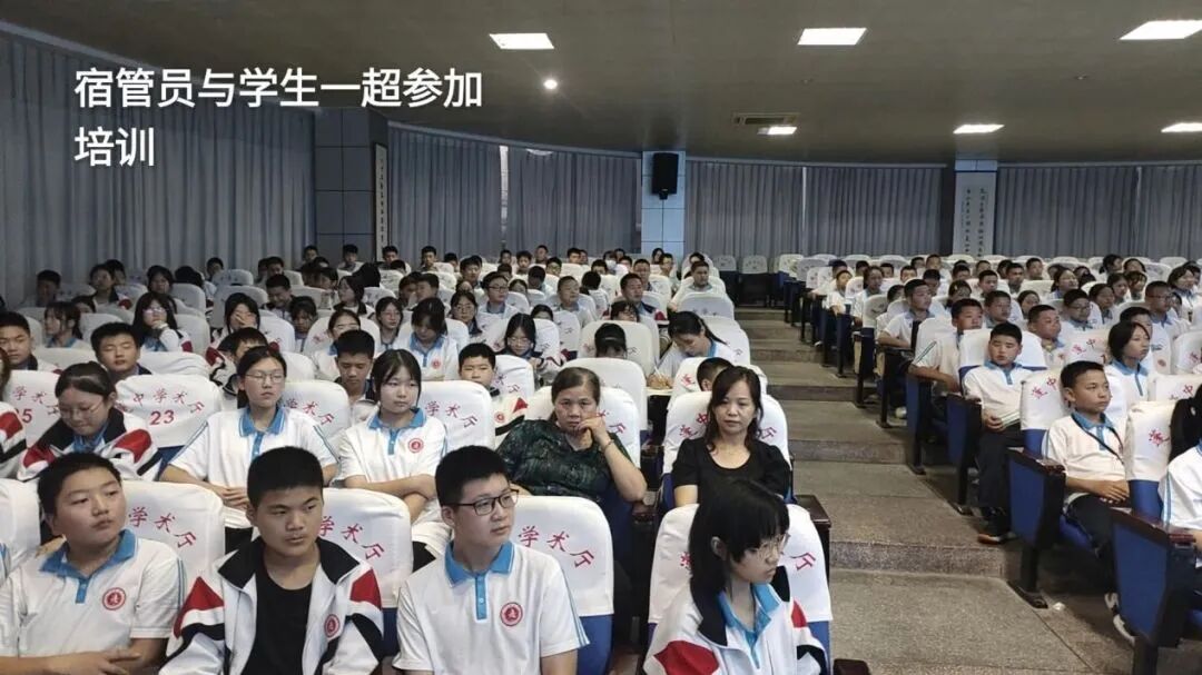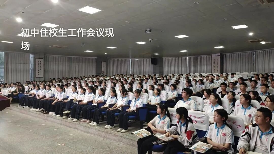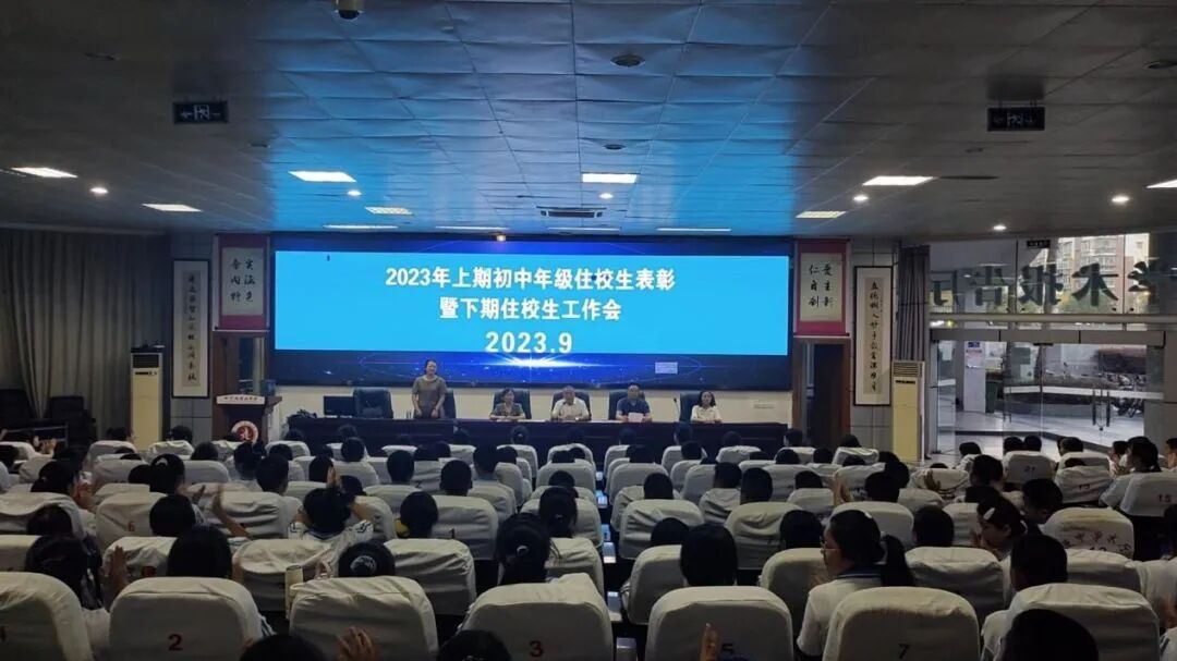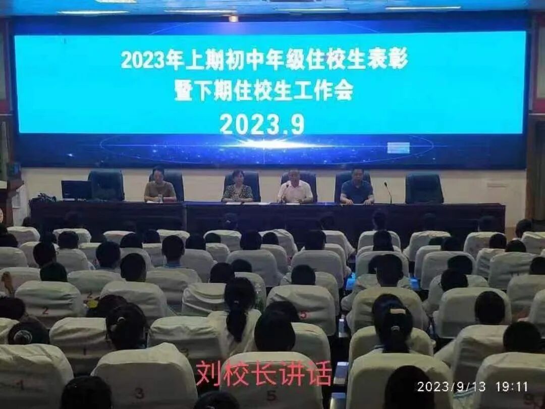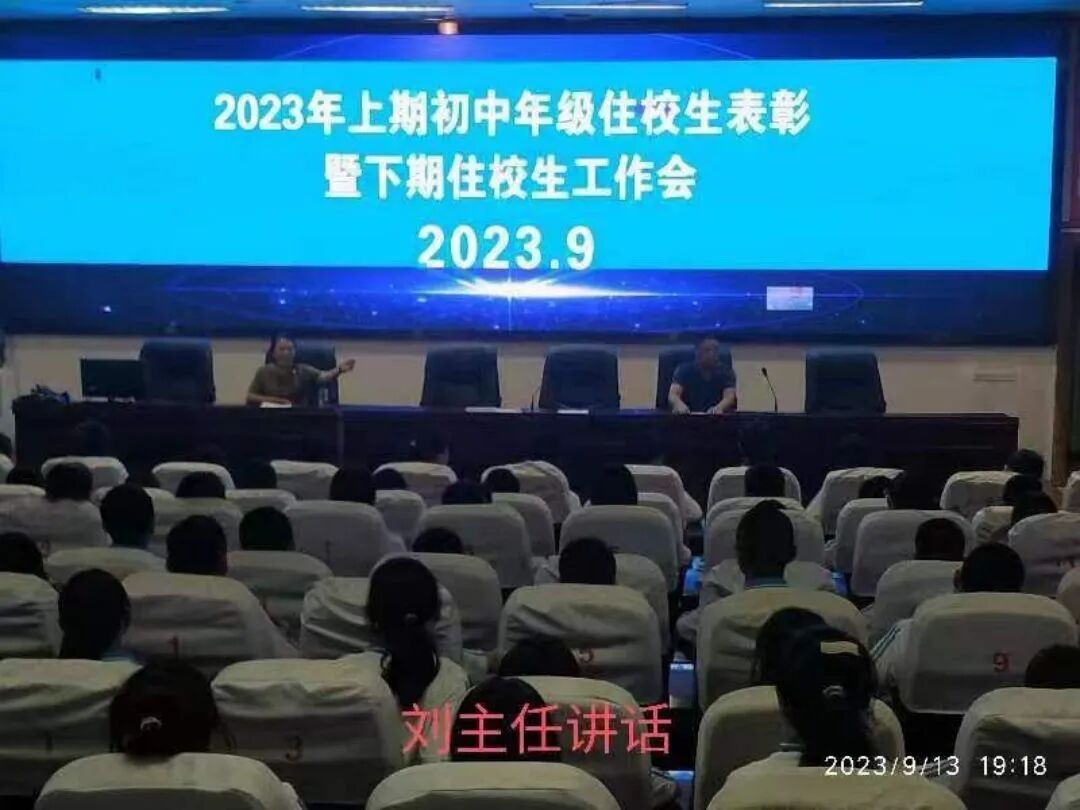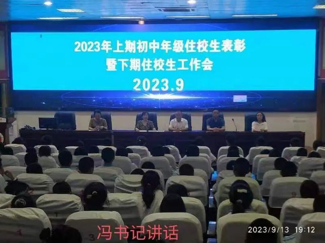 四川省蓬溪中学校初中部住校生工作会议,在蓬溪中学学术报告厅召开。会议由副校长刘鸿杰副校长主持。大会主要有三个议程。第一个议程:冯铧主任宣布获得2022年至2023年优秀寝室名单及优秀室长名单。第二个议程:由学校党委副书记冯春梅同志给住校生讲希望与要求。第三个议程是:政教处副主任刘艳主任对住校生进行培训。宿管人员与学生一起参加培训会。