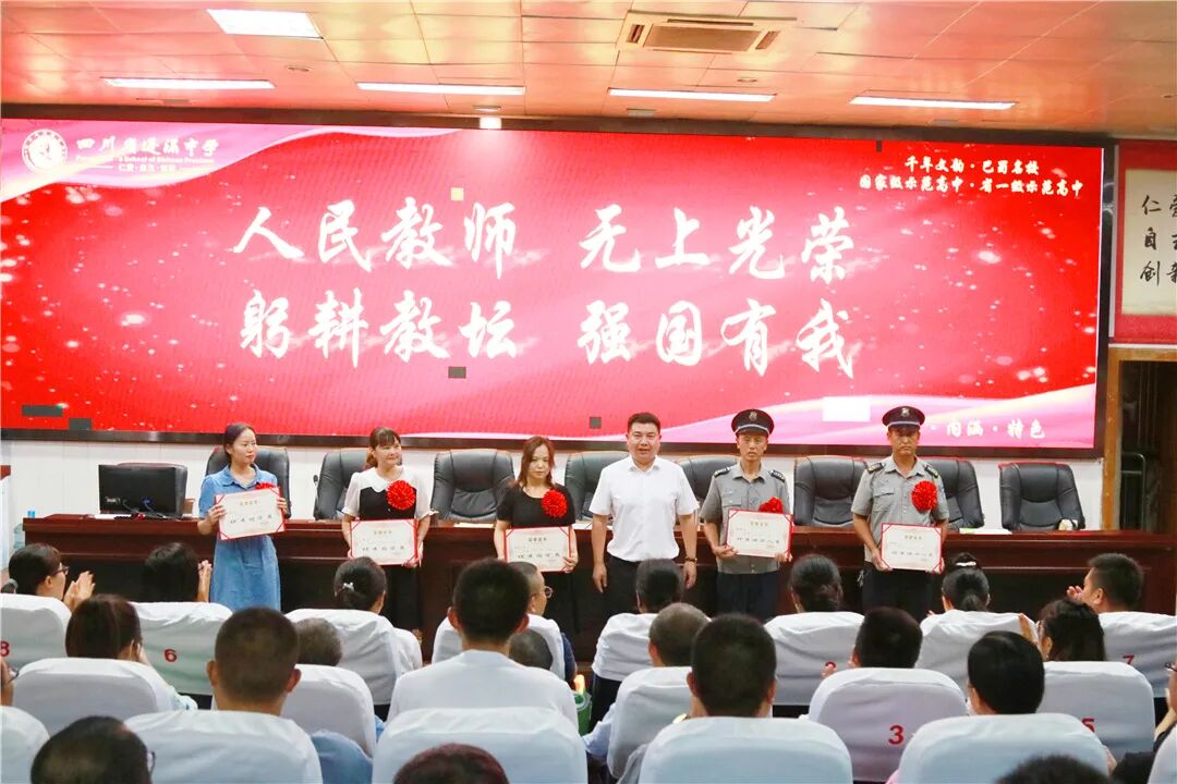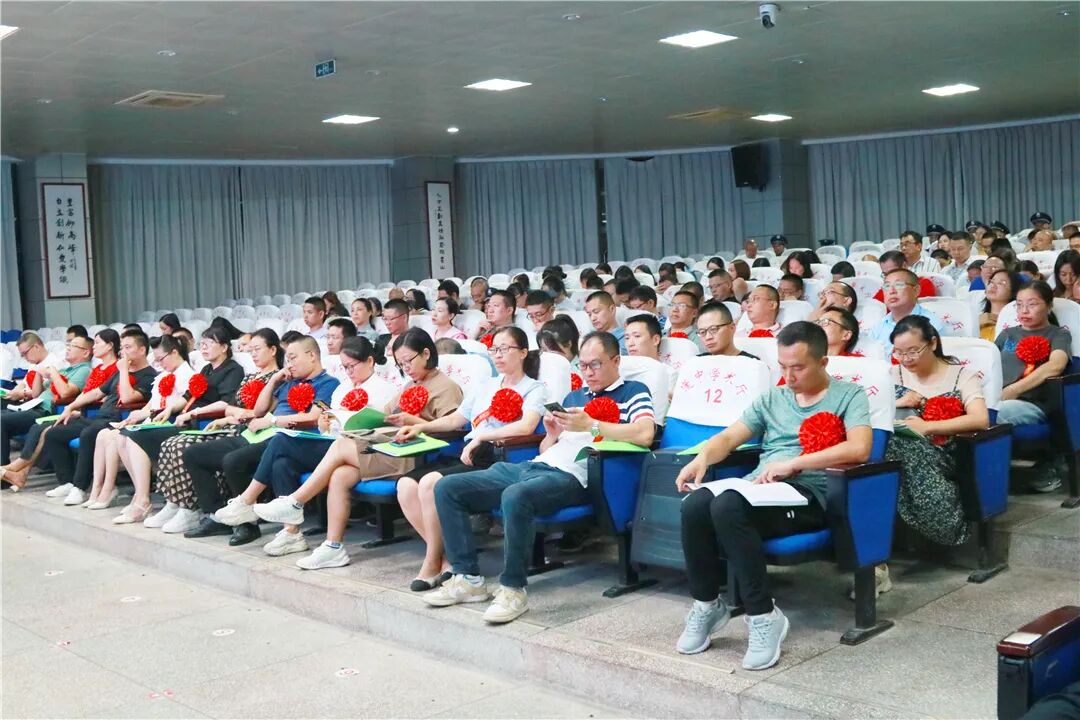 政教处副主任胡军宣读2023年上期优秀班主任、班主任之星、安全之星、学生工作优秀指导教师、优秀宿管员、优秀保卫人员的表彰文件,校级领导为获奖人员颁发荣誉证书。