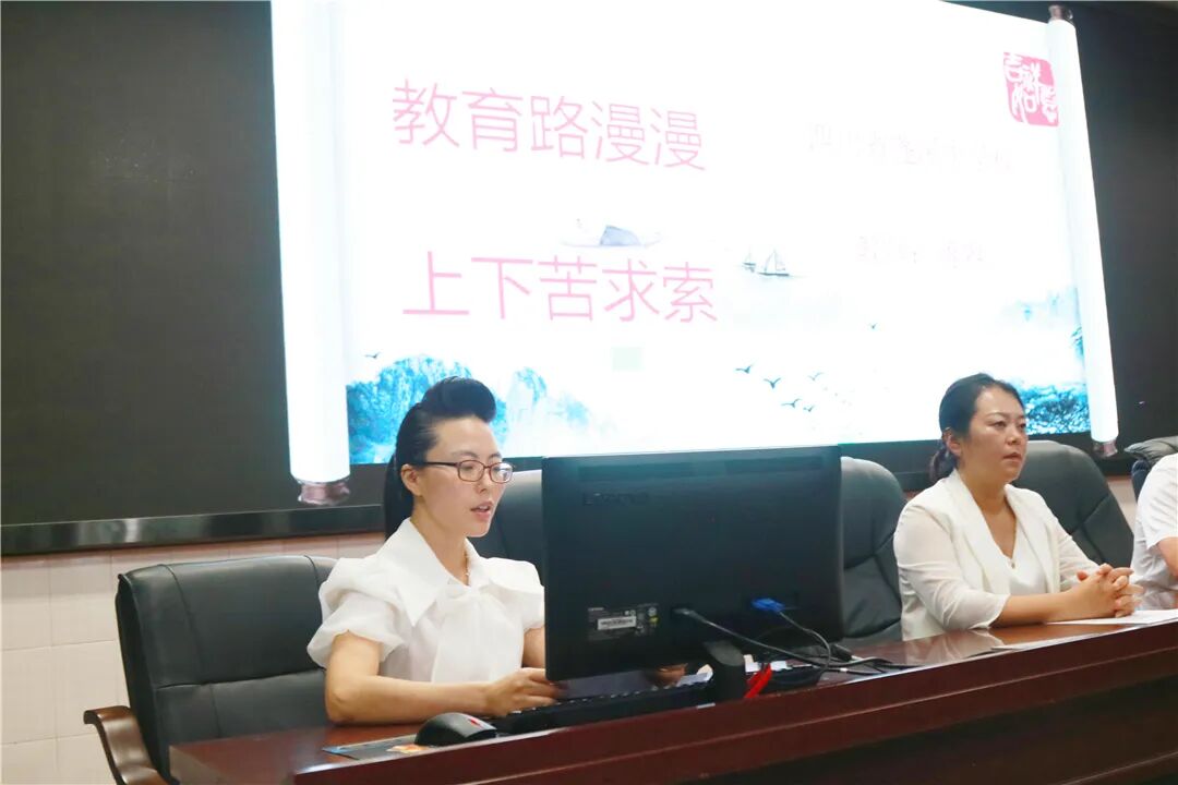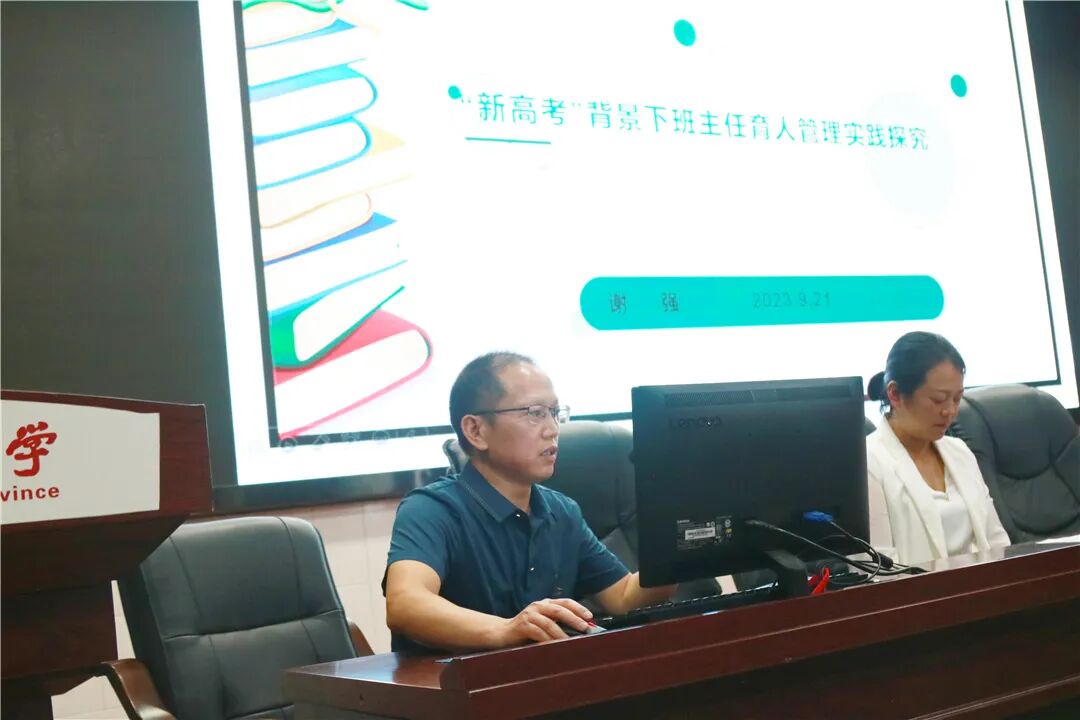 在交流发言环节,班主任代表蒋蓉老师以《教育路漫漫,上下苦求索》与大家做了交流,他和大家一起分享了带班故事,并将带班育人理念总结为:养成习惯成就幸福人生;树立理想奠基幸福未来;学会共处走向幸福远方。高二的谢强老师以《新高考背景下班主任育人管理实践探究》为题,从“新时期班主任应该成为怎样的人?”“新高考背景下如何做好班务工作?”和“新高考背景下班主任工作的几点尝试”三方面同大家进行了交流和分享。