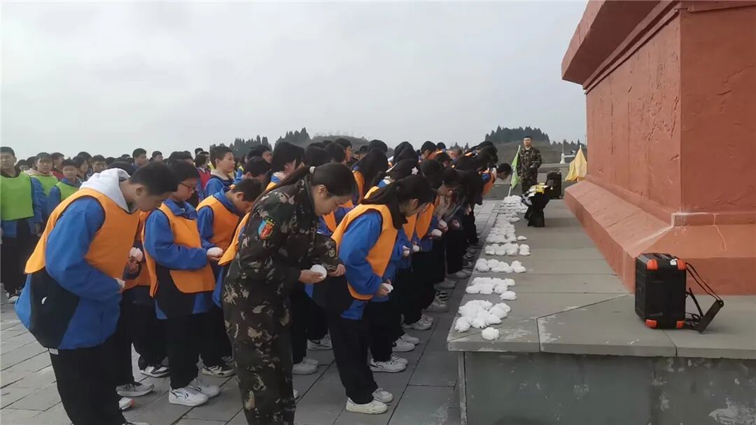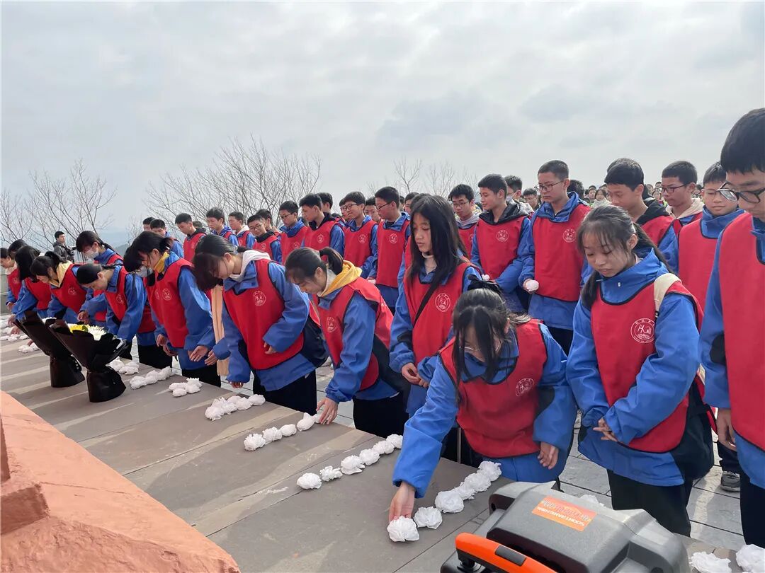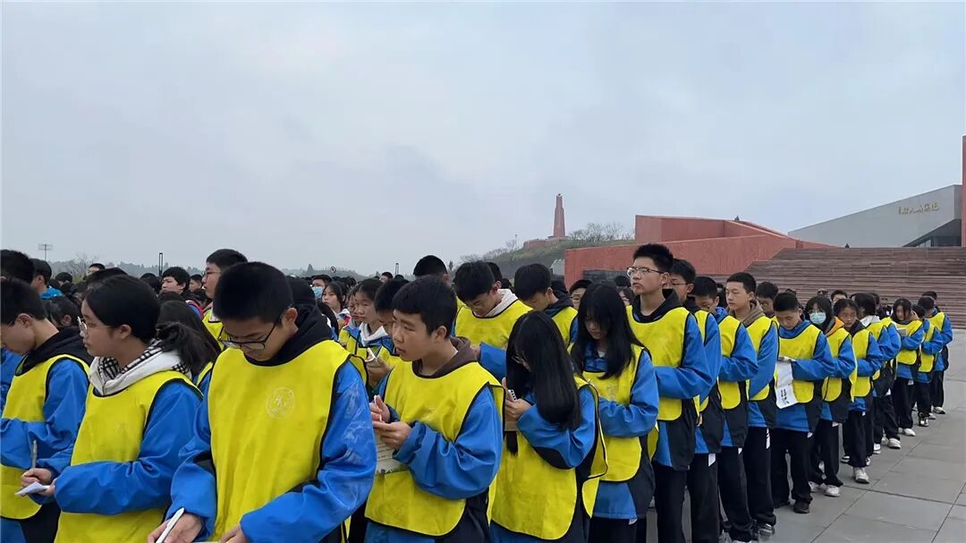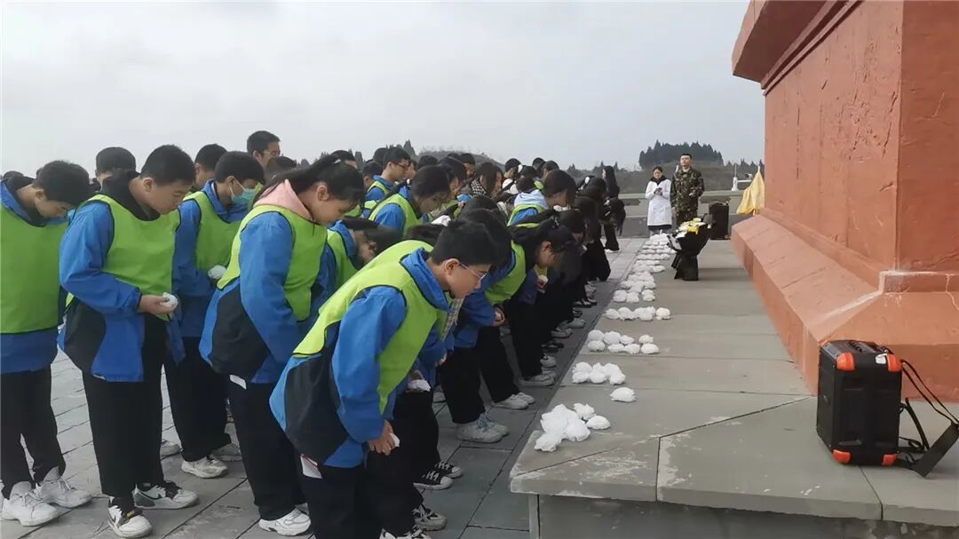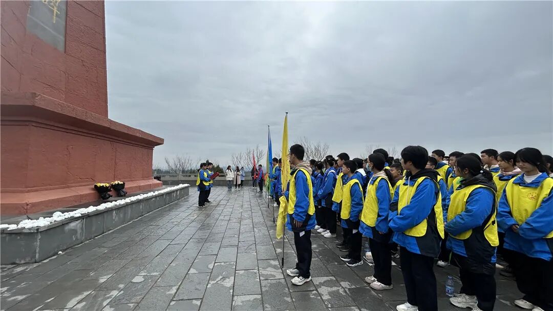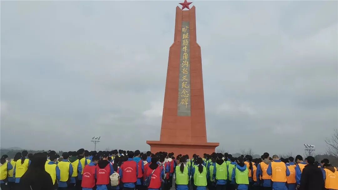 稍后,同学们来到旷继勋牛角沟起义纪念碑前举行缅怀仪式。学生代表深情念诵祭文,全体师生鞠躬默哀,同学们怀着崇敬而沉痛的心情为先烈们庄重献上亲自制作的白花。最后,全体师生高唱《歌唱祖国》,学生们高呼“请党放心,强国有我”,震耳欲聋的誓言响彻整个牛角沟。