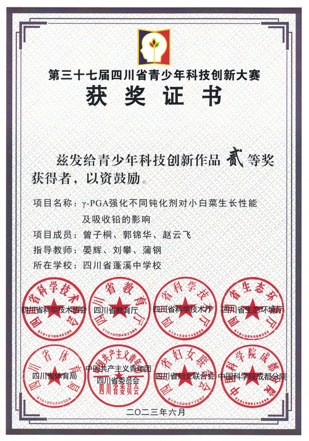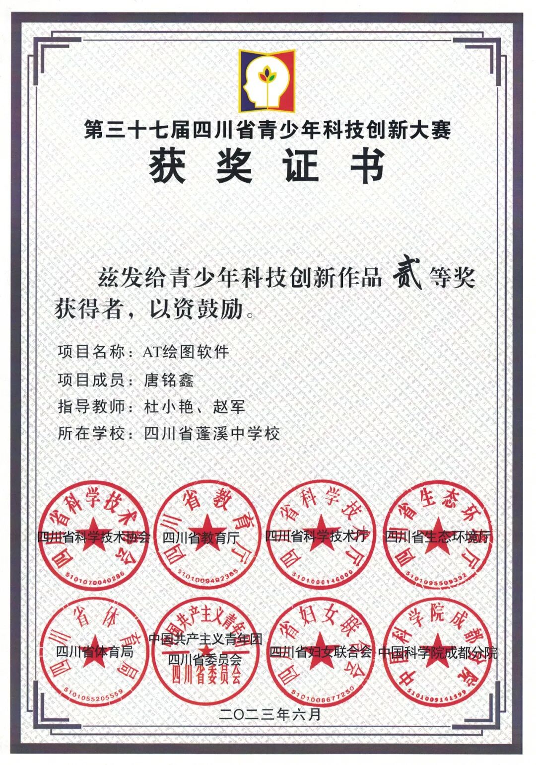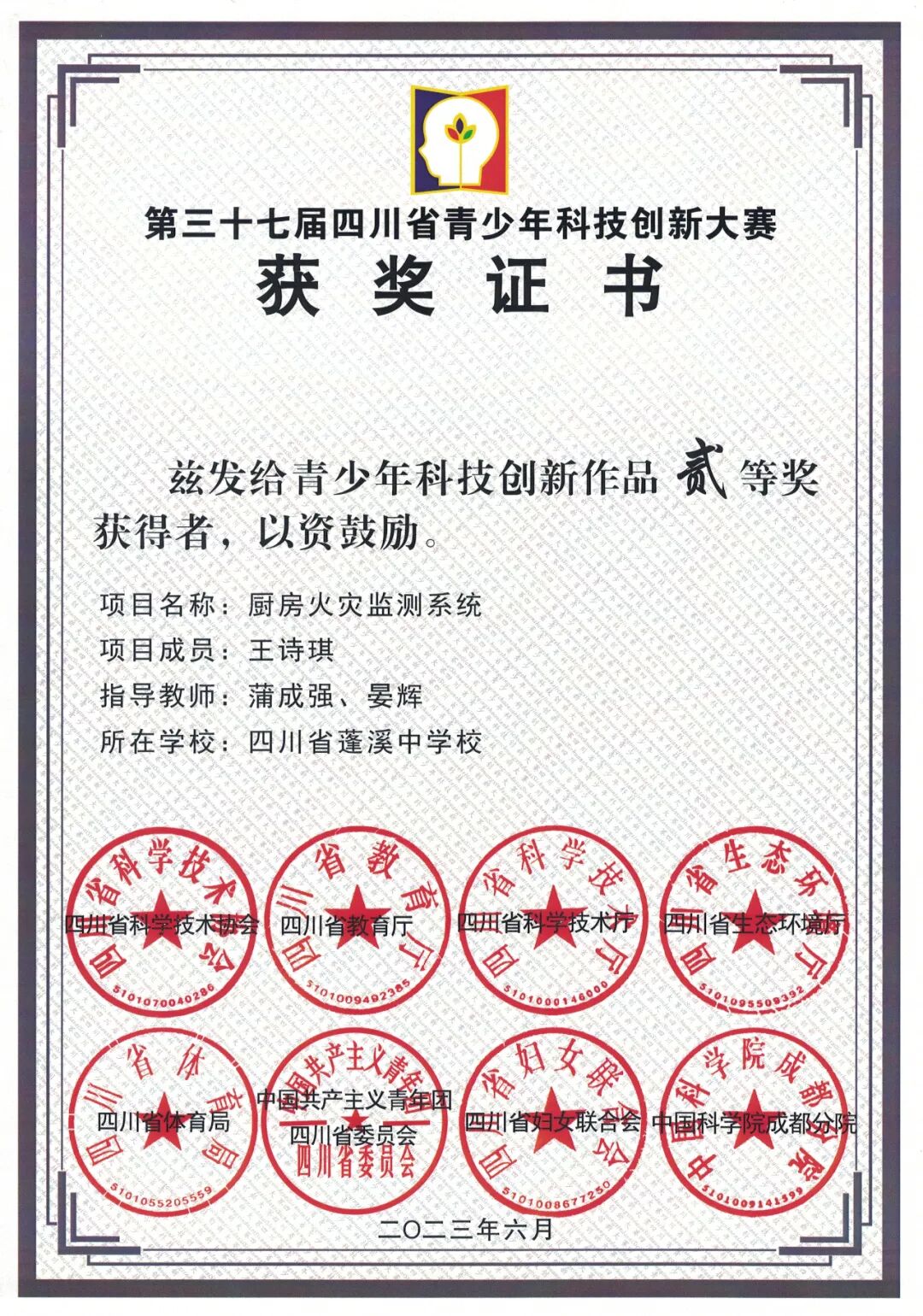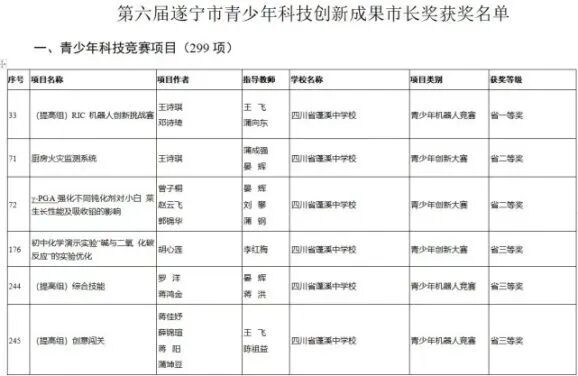 在2023年四川省青少年科技创新大赛中,遂宁市各级各类学校获得二等奖及以上共九个作品,我校占三个;其中全市唯有两个获得科学出版社等授予的科技创新专项奖作品,均被我校学生夺得。