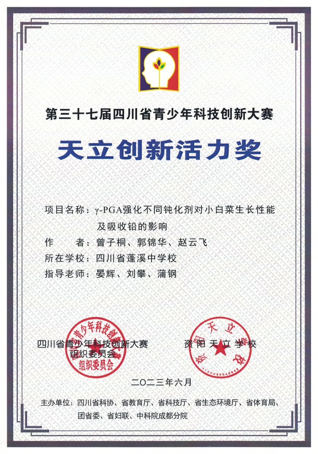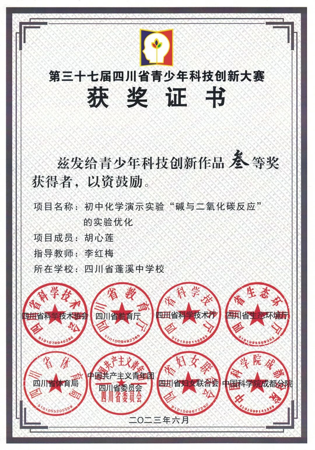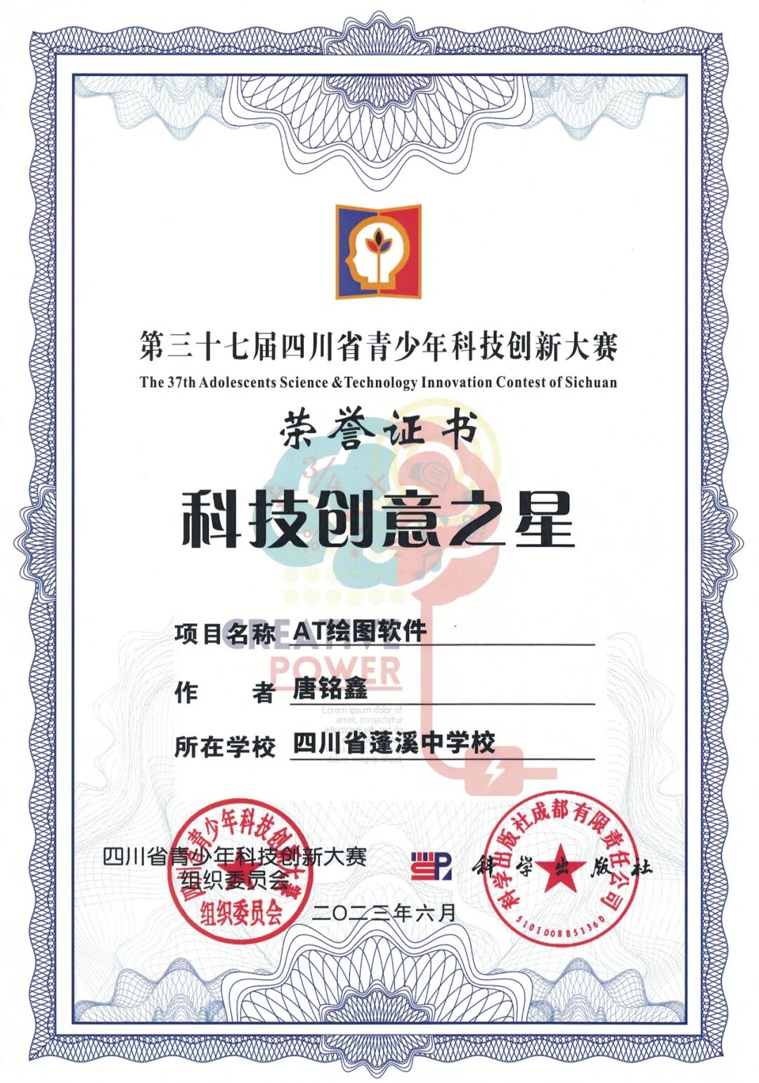 在2023年四川省青少年科技创新大赛中,遂宁市各级各类学校获得二等奖及以上共九个作品,我校占三个;其中全市唯有两个获得科学出版社等授予的科技创新专项奖作品,均被我校学生夺得。