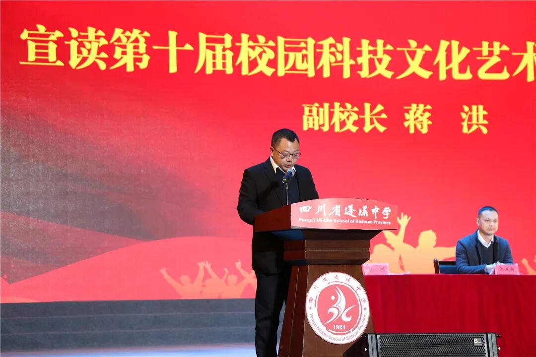 会议在蓬溪中学校长杨加林的主持下于晚七点正式开始,会议共五项议程。首先由蓬溪中学副校长蒋洪同志宣读第十届校园科技文化艺术节表彰文件,随后举行了第十届校园科技文化艺术节“优秀集体”、“优秀个人”颁奖仪式。