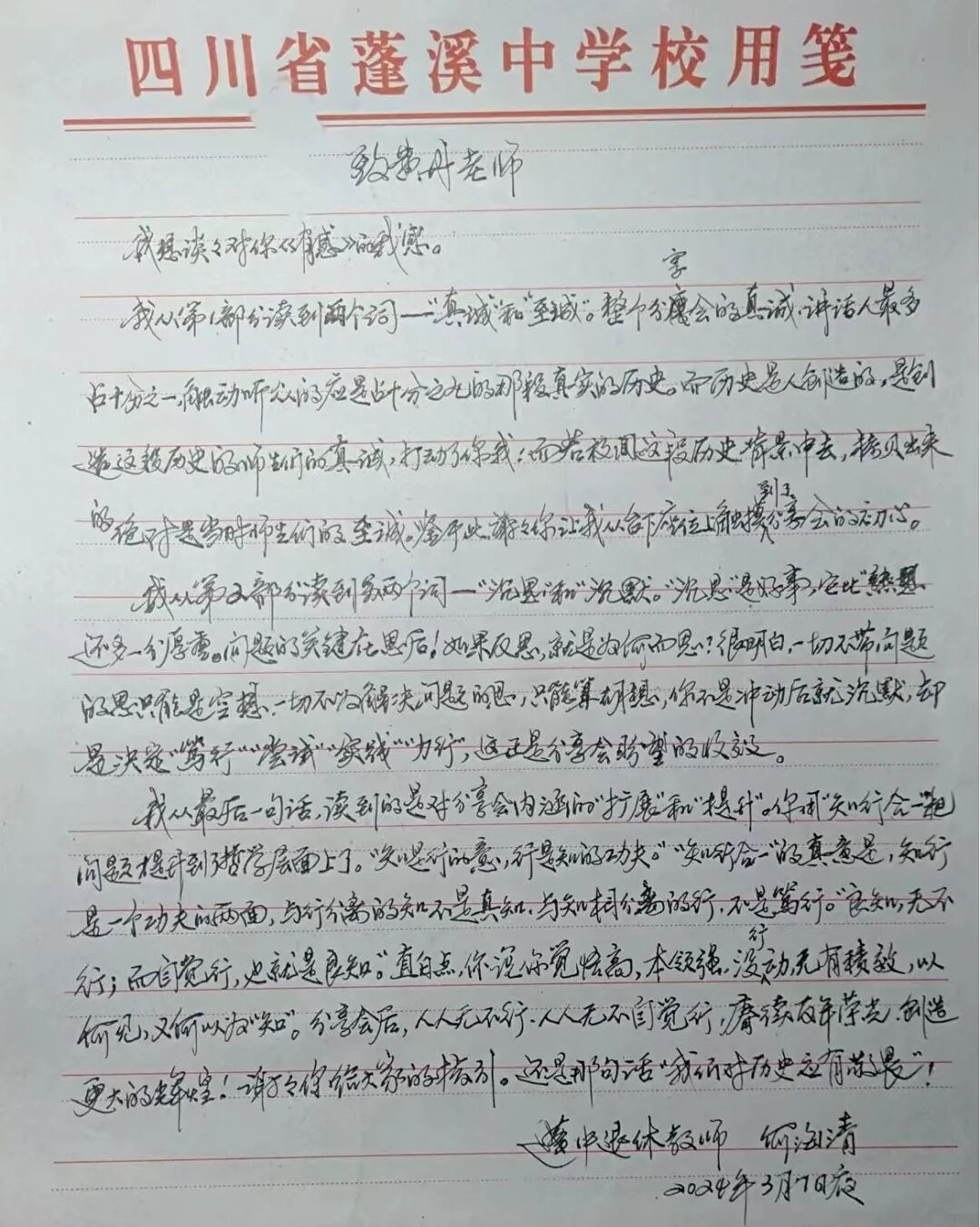 厚厚的手写讲稿,书写的是老一辈蓬中人的教育情怀。讲到动情处,稿子一扔,蓬中的一砖一瓦、一人一事如数家珍,在座教师屏息聆听,备受鼓舞。会后,老师们与何老进行了特别的书信交流。