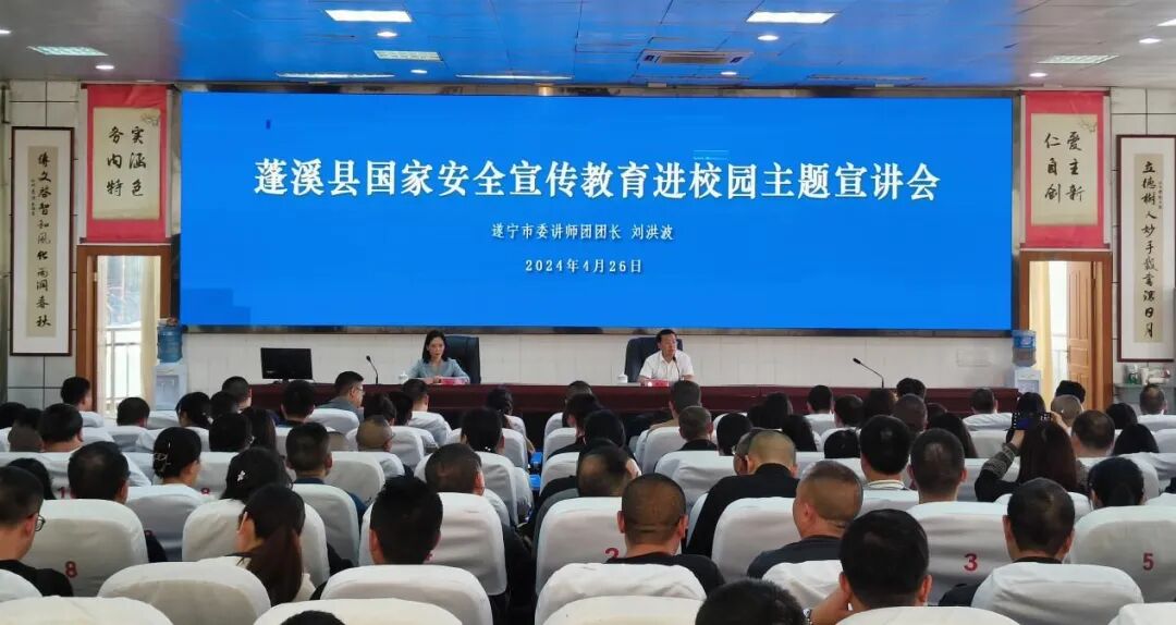 4月26日下午,以“携青春作伴·与安全同行”为主题的蓬溪县2024年国家安全宣传教育月活动暨国家安全进校园活动在蓬溪中学学术报告厅隆重举行。此次活动得到了县委、县政府的高度重视,县委副书记何云峰亲自担任活动主持人,市委讲师团团长刘洪波担任主讲嘉宾。县委相关单位、各乡镇、各学校分管领导和各学校思政课教师代表以及蓬溪中学140余名初高中学生代表聆听了宣讲报告。