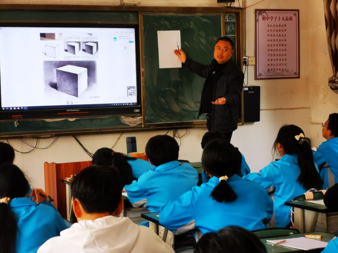 美术教师彭端针对明月中学初三学生面临的中考压力,为部分同学寻求一条艺术特长生道路,认真组织他们系统学习静物素描基础,教授他们认识识别结构素描和调子素描的区别并基本掌握其画法,同时也讲授了漫画知识,激发他们的绘画潜能,拓宽艺术视野,为培养良好的艺术素养打下了良好的基础。通过走教活动,进一步促进了城镇和农村学校的教师交流,缓解了农村学校音、体、美教师缺乏的压力,提高了乡村学校音体美的教学质量,促进了义务教育的均衡发展。