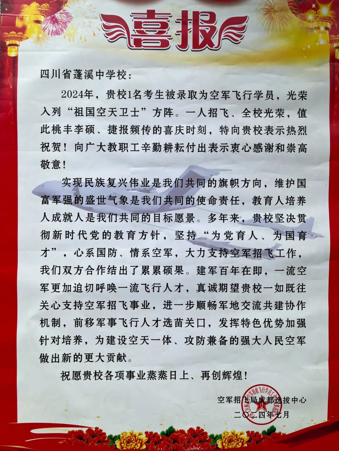 空军招飞成都选拔中心发来喜报,我校学子姚文君同学被录取为空军飞行学员。在此特别祝贺姚文君同学,希望你努力学习,勤奋训练,成为一名优秀的空军飞行员,保家卫国,为母校争光,为祖国添彩!