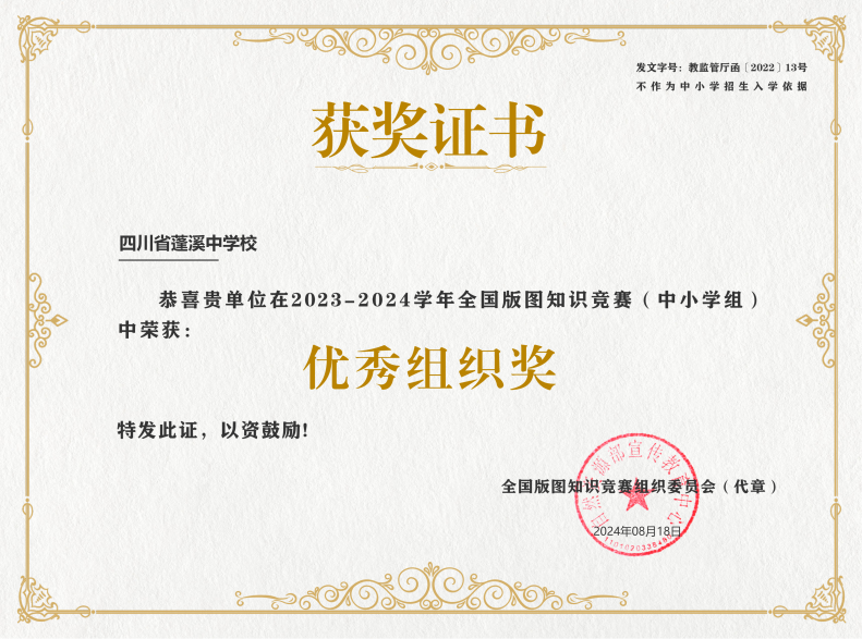 近日,第五届“全国版图知识竞赛”落下帷幕,蓬溪中学121名同学获奖。全国版图知识竞赛(中小学组)是教育部批准(教监管厅函〔2022〕13号)举办,由自然资源部宣传教育中心主办,中国地图出版集团、自然资源部地图技术审查中心、中国测绘学会协办的全国性国家级知识竞赛。