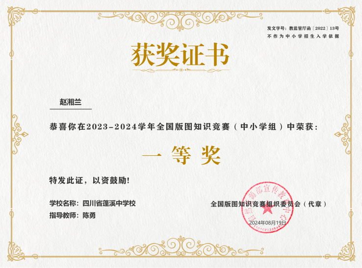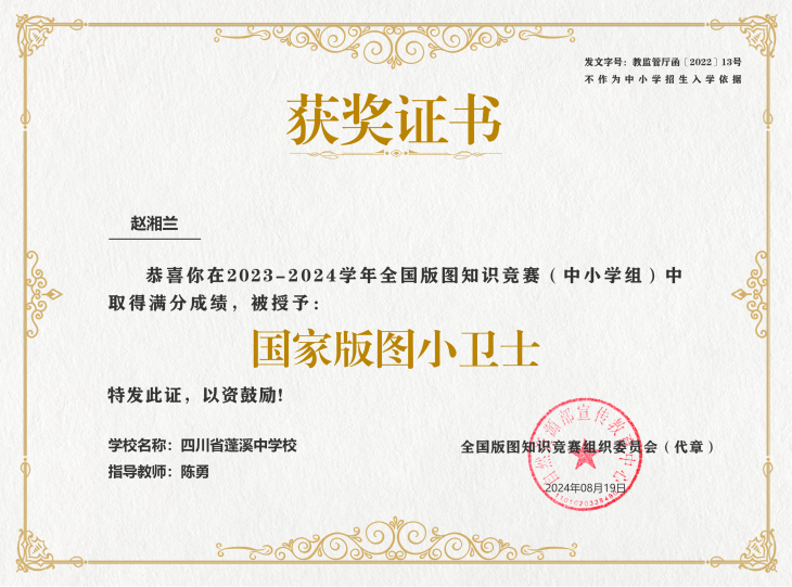 高2022级12班赵湘兰同学以满分、一等奖的优异成绩荣获“国家版图小卫士”称号。