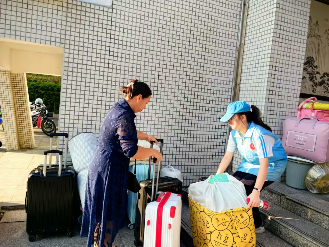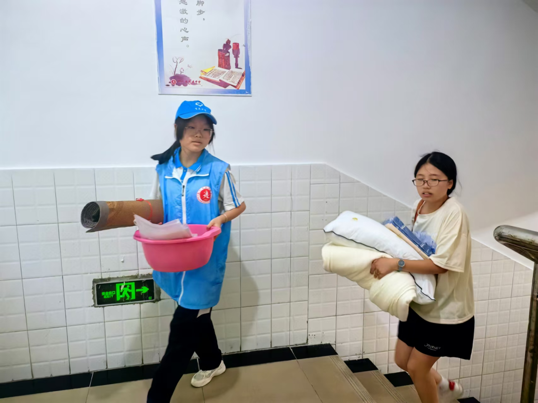 在宿舍区,志愿者们帮助新生找到自己的宿舍,搬运行李,并向他们介绍宿舍的注意事项。