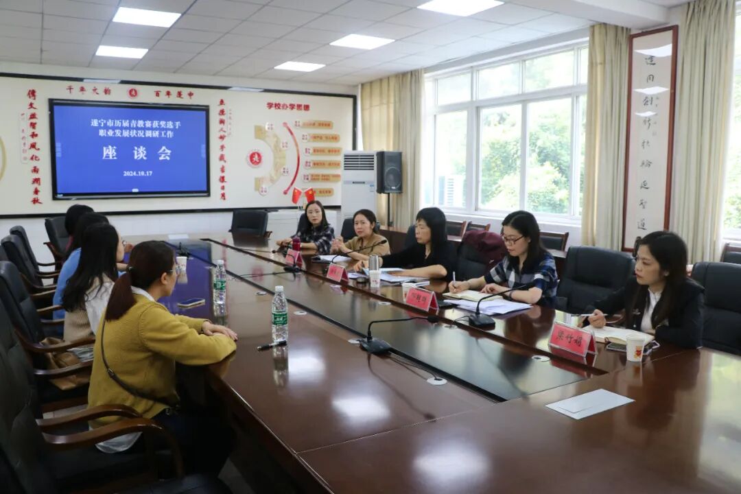 10月17日下午,遂宁市教育和体育局行业工会副主席钟素君率领团队来到蓬溪,对历届青年教师教学竞赛获奖者的职业发展进行了深入调研。此次调研活动在蓬溪中学勤政楼三楼会议室举行,蓬溪县教育和体育局教研室副主任李春梅、计财股副股长梁竹娟以及蓬溪中学校长杨加林等领导参与了调研。