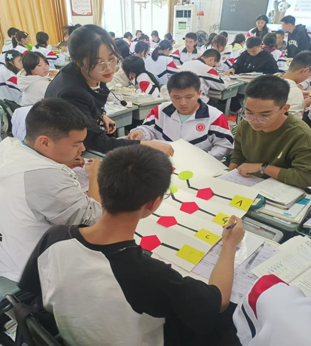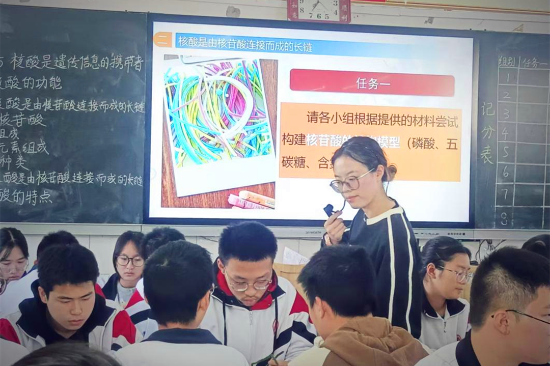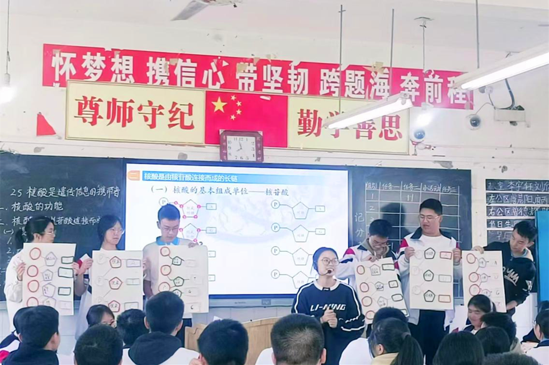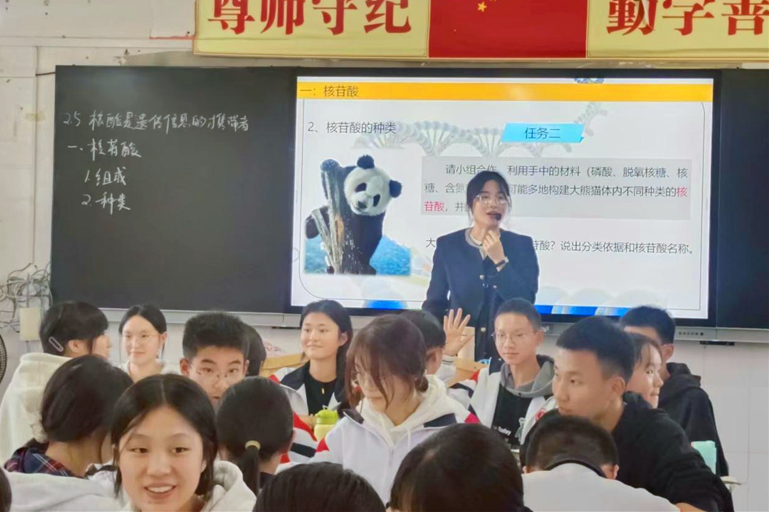 范诗雨和王甜两位老师分别进行了汇报展示。两位老师采用同课异构的方式选取“核酸是遗传信息的携带者”章节进行授课。范诗雨老师采用由总到分,从核酸的功能深入核酸的结构进行分析。利用扭扭棒进行模型建构,并一材多用使之串联三个学生任务,有效激活了学生思维。王甜老师采用由分到总,以基本单位核苷酸引入核酸的结构至功能的探究,整堂课利用大熊猫身份证为主线一境到底,使整个课堂生动有趣。汇报课上,两位教师立足学生实际,精心设计教学环节,她们运用创设情境、任务驱动等多种教学手段落实立德树人的教学理念。
