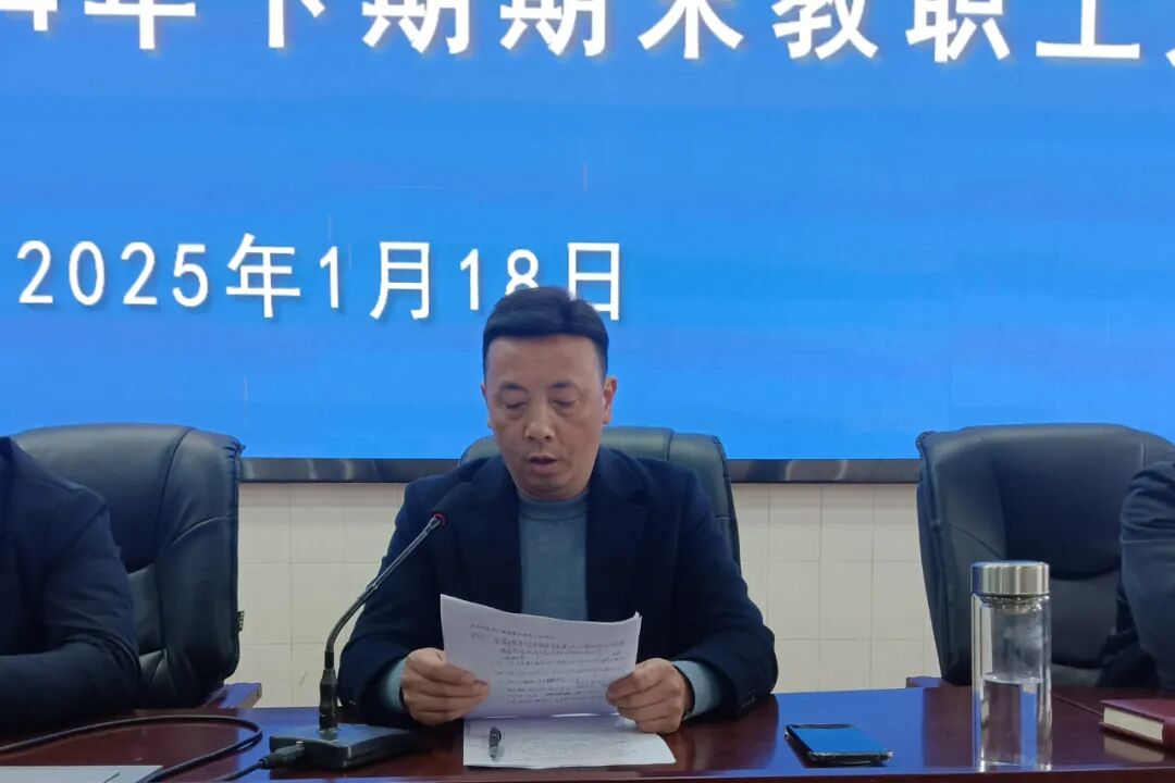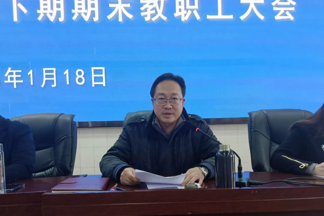 学校党委书记胥杰进行总结发言。他通报了学校一年来取得的显著成绩,向全体辛勤付出的教师表示了真诚的感谢。同时,他还向与会人员通报了学校人事变化及领导分工的变动情况,对绩效考核、假期政治学习、寒假放假事宜等工作进行了详细安排。