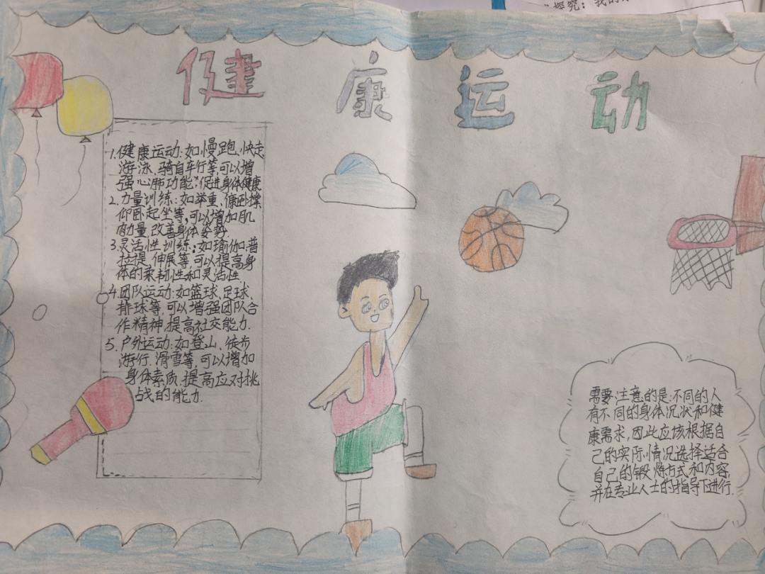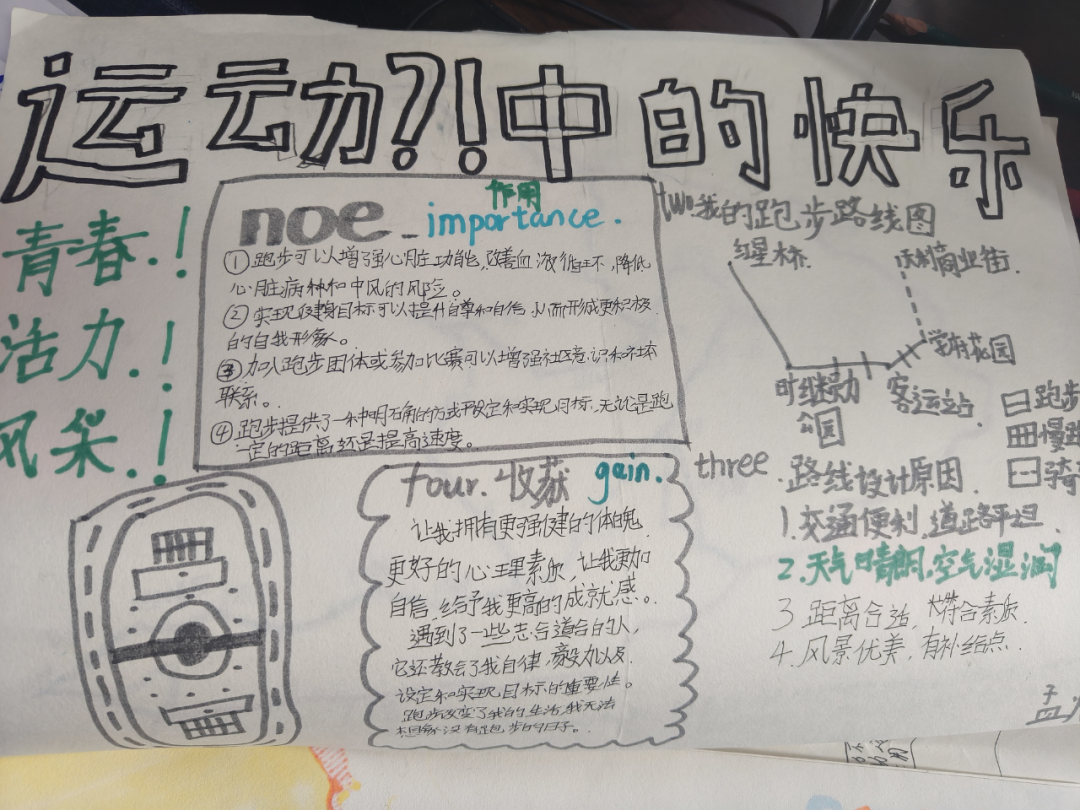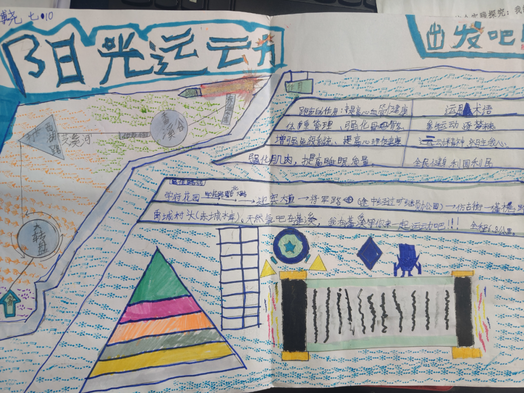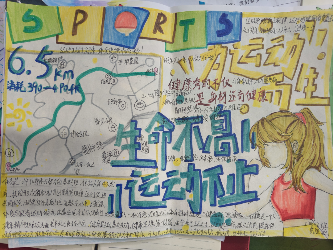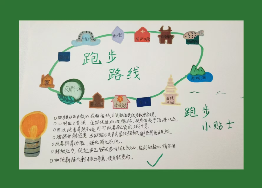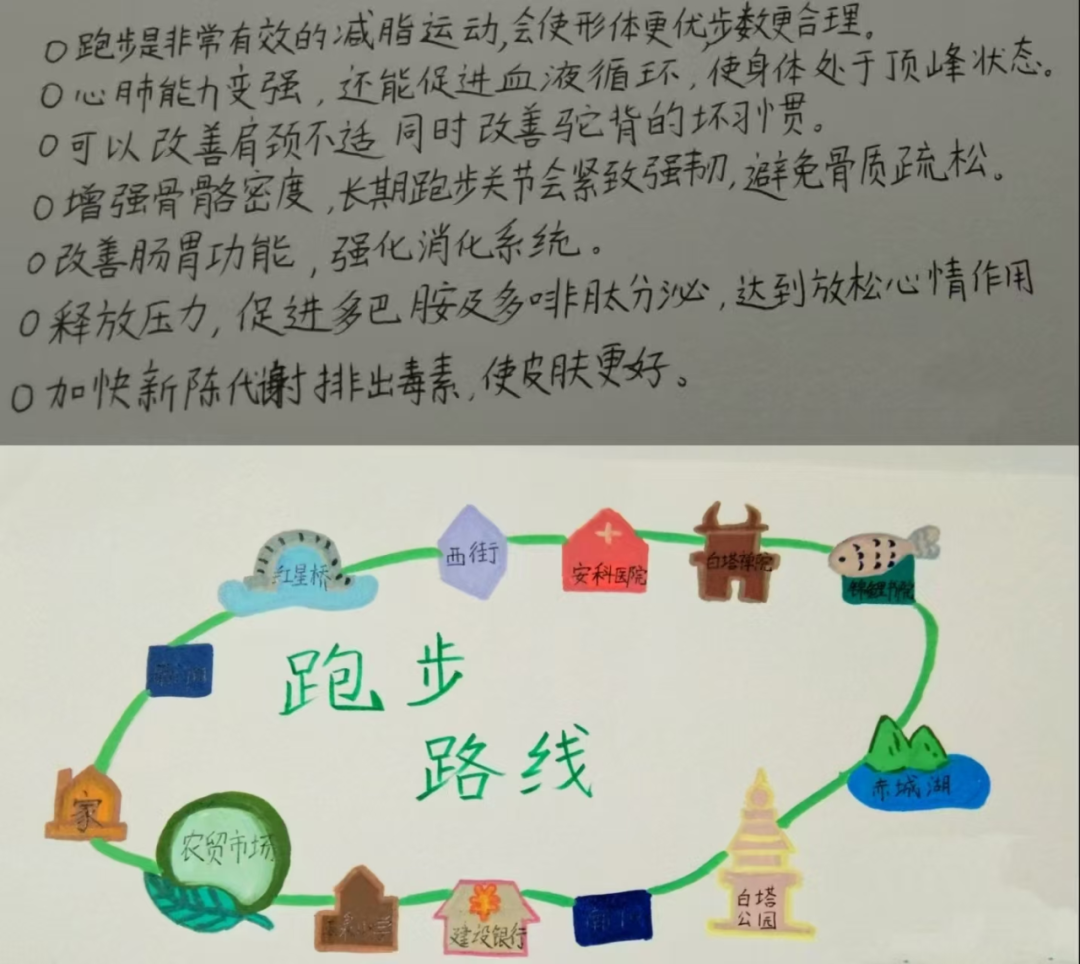 一、寒假中,同学们有更多的机会陪伴家人,他们结合所学的知识与自己的实践经历,绘制了健身路线导览图,带动更多的人参与到“健康运动”的风潮中来。