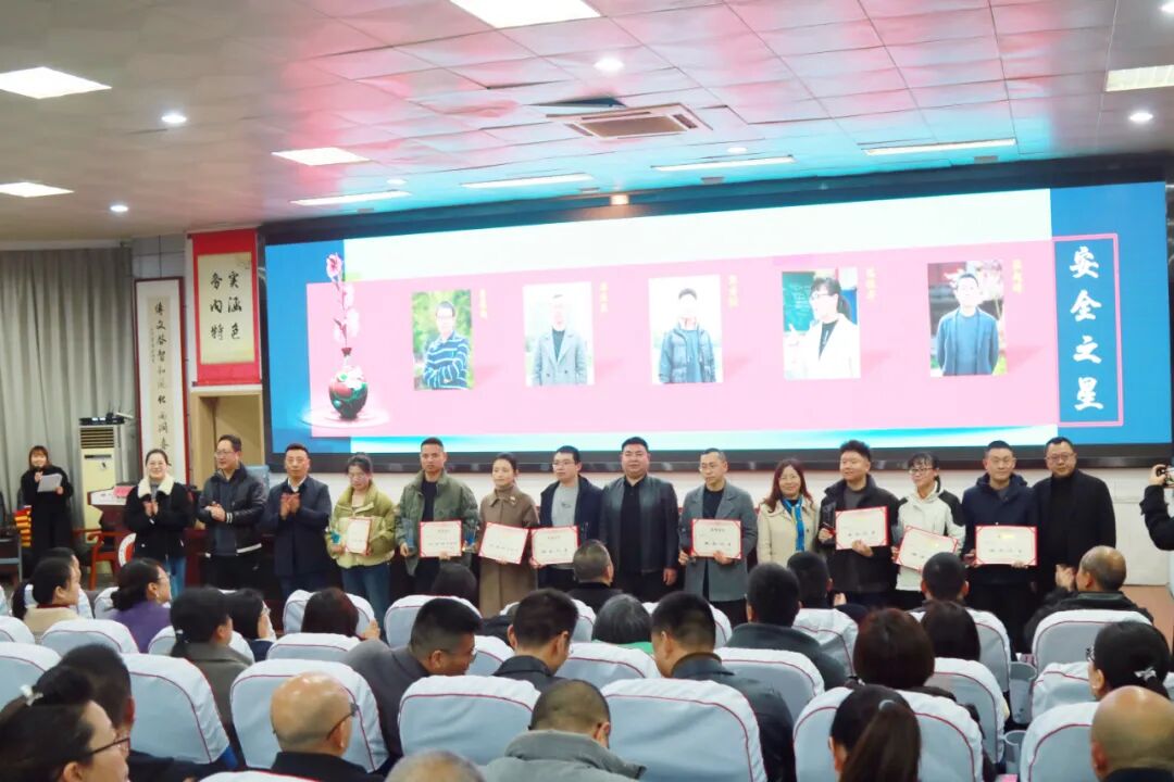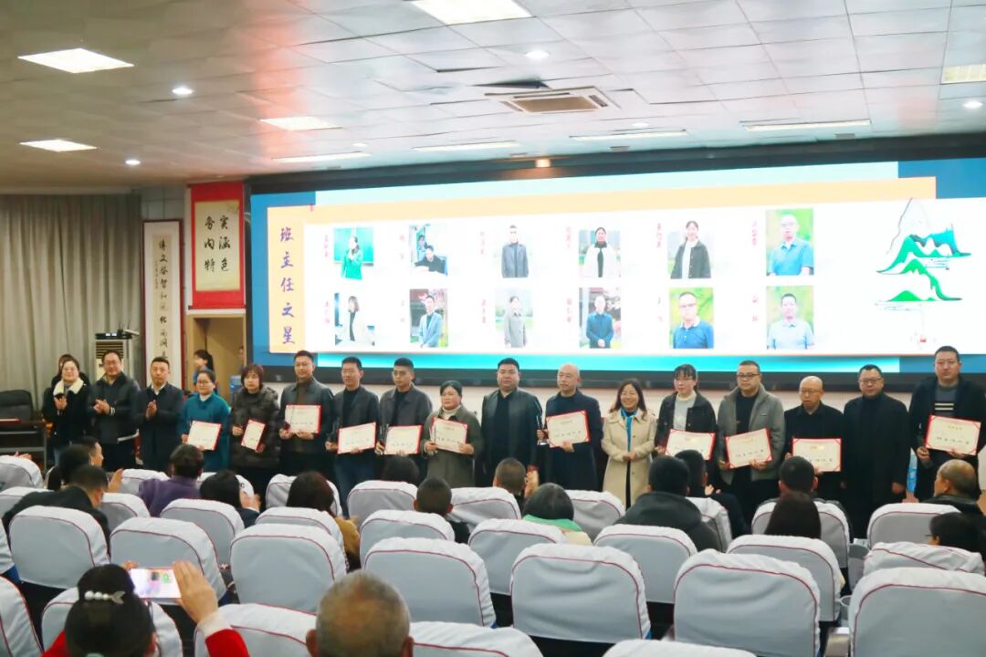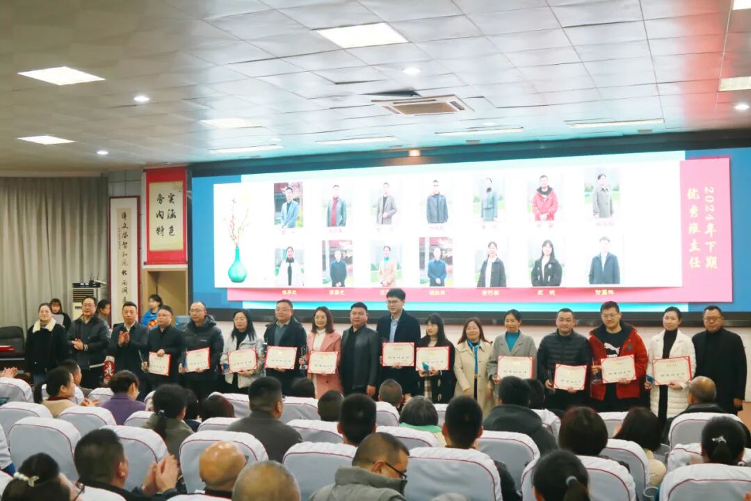 政教处主任胡军宣读2024年下期优秀班主任、班主任之星、安全之星、学生工作优秀指导教师、优秀宿管员和优秀安保员表扬文件,校级领导为获奖老师颁发了奖杯和荣誉证书。