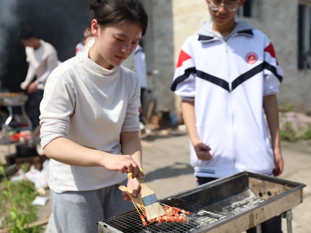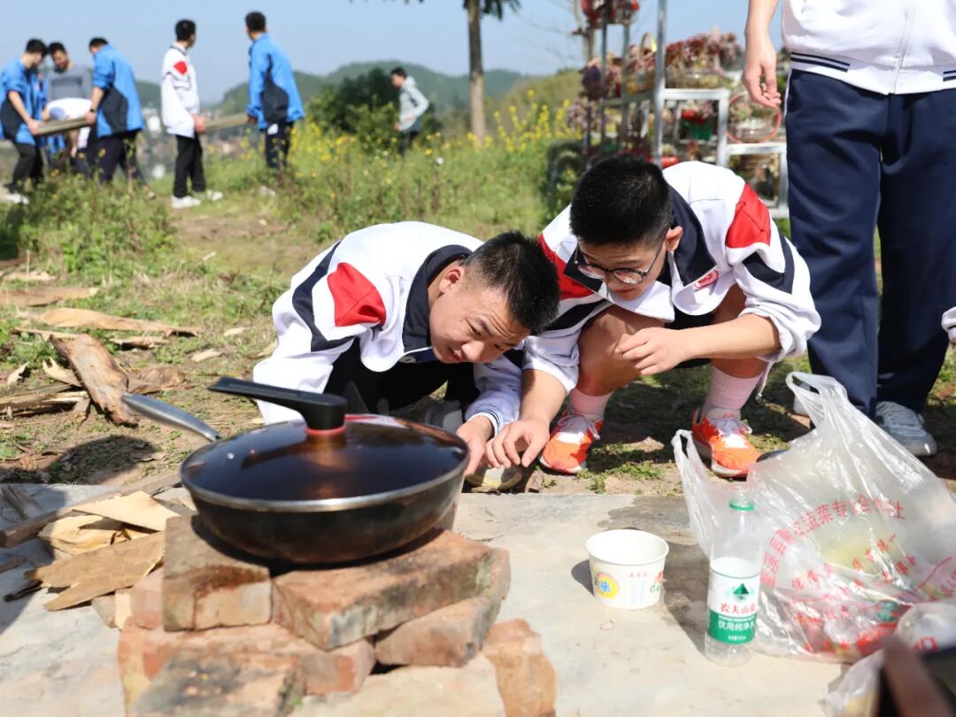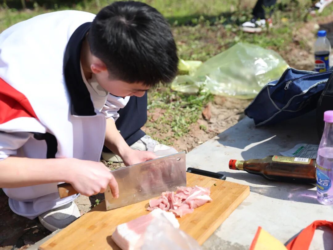 上午十一点左右,同学们到达目的地,开始进行期待已久的野炊。大家按照分好的小组,兴致勃勃地搬砖,搭灶,取材,生火。生火的过程艰难也有趣,有小心翼翼挡风的,有灶中冒出浓烟,把大家熏出眼泪的。同学们的厨艺真不错,有就烧鸡翅和铁板牛肉的,边倒边翻,一气呵成。有摆烧烤的,火焰像舌头一样舔着羊肉串,香味馋得大家口水直流。有烫火锅的,鸳鸯锅里,毛肚、牛肉翻滚,白菜、豆腐漂浮。大家吃得津津有味,这是劳动的收获与快乐,更是一种美好的人生体验。