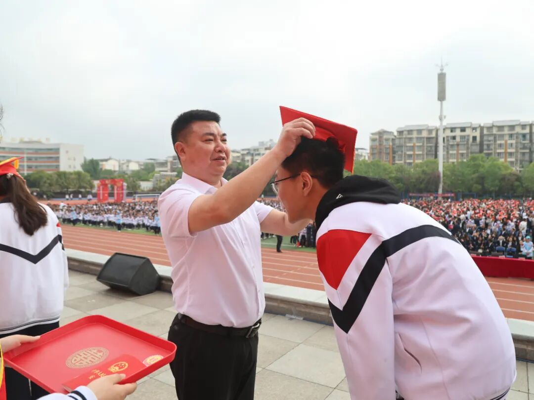成人礼环节将活动推向高潮。教师与家长为高三学子佩戴成人帽、纪念徽章,并赠送《宪法》读本。随后,高三12班王语璠同学带领学子们庄严宣誓:“以我火红青春,建设锦绣中华!”誓言铿锵,责任昭然。佩戴成人帽、纪念徽章