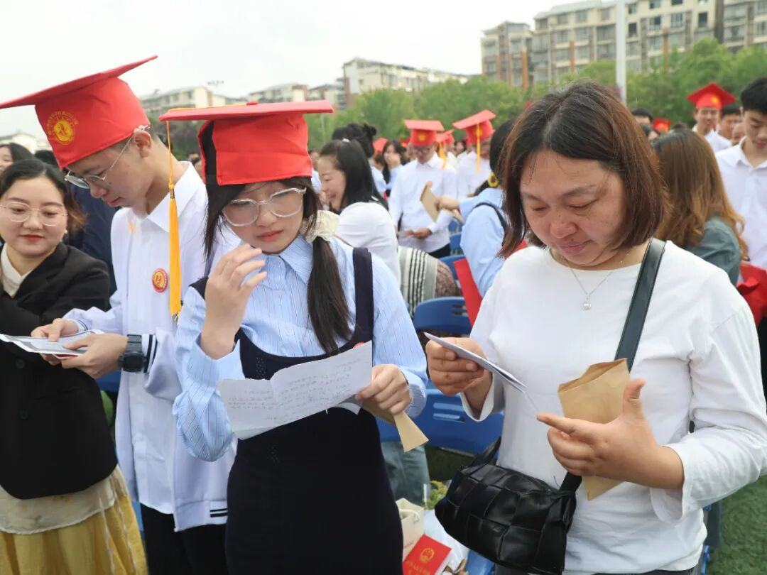 在悠扬的音乐中,全体学生行三鞠躬感恩礼——感谢祖国培育之恩,感谢师长教诲之情,感谢父母养育之爱。家长与学生互换家书,温情涌动,纸短情长,凝聚亲情与期望。红毯为证,迈向人生新篇