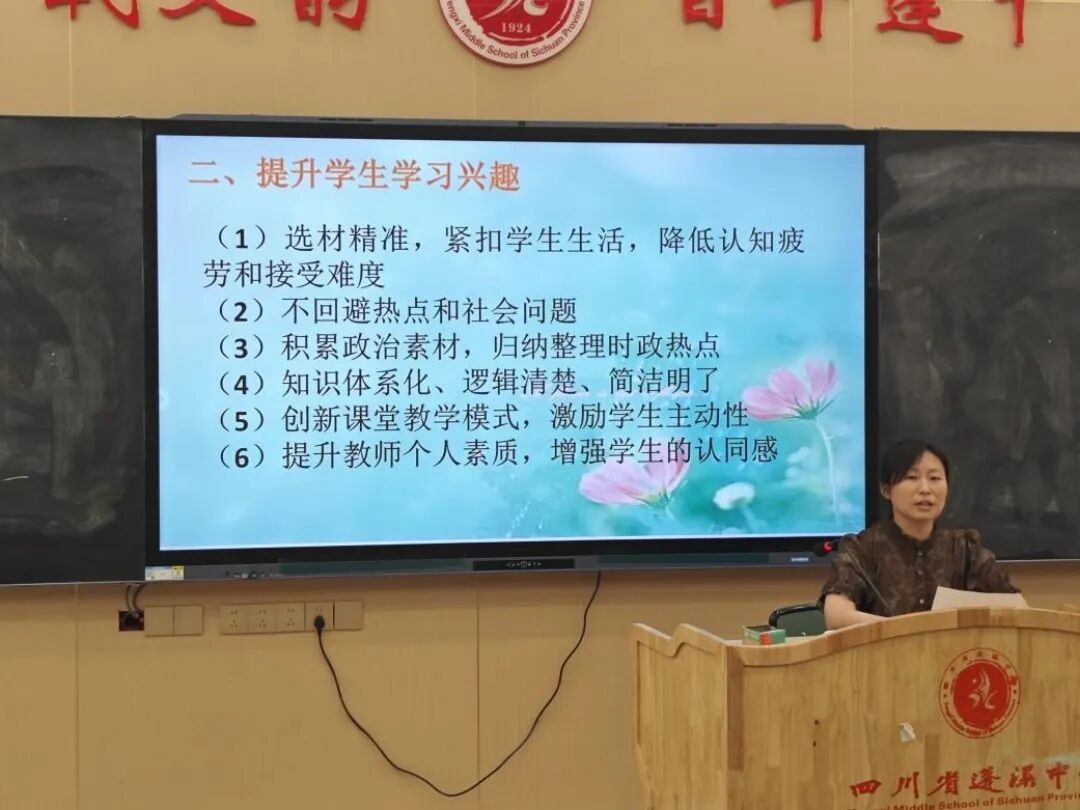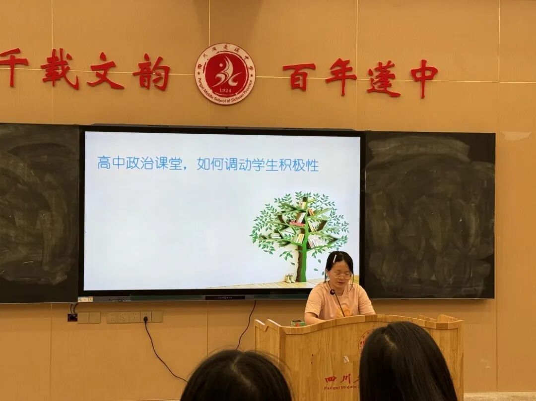 刘茜老师以“高中政治课堂如何调动学生积极性”为主题,从上课、习题评讲、月考后三个环节展开分享。