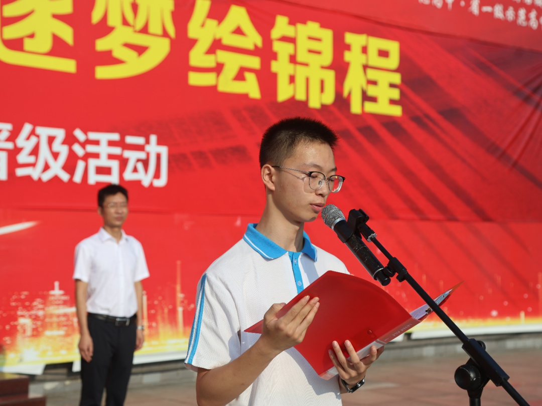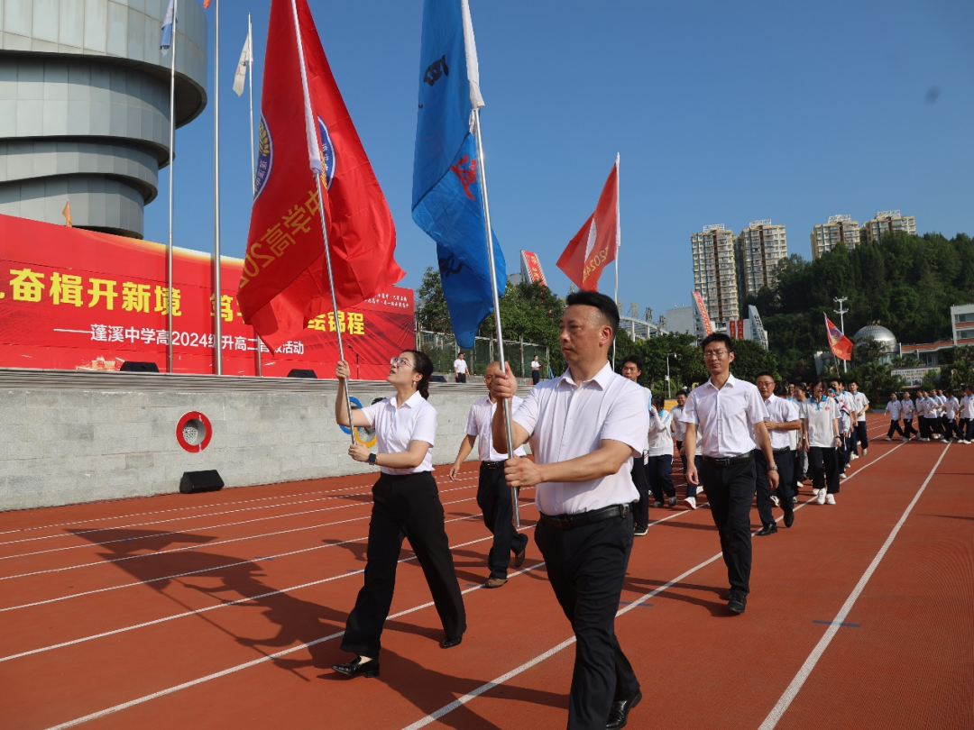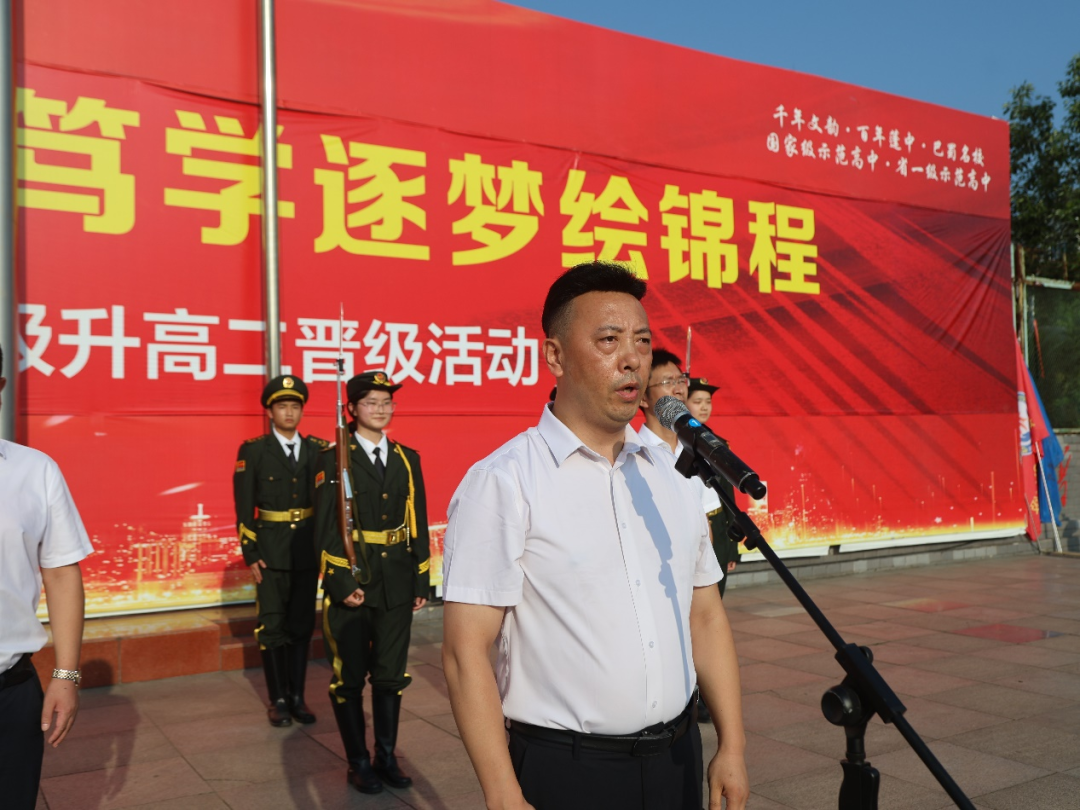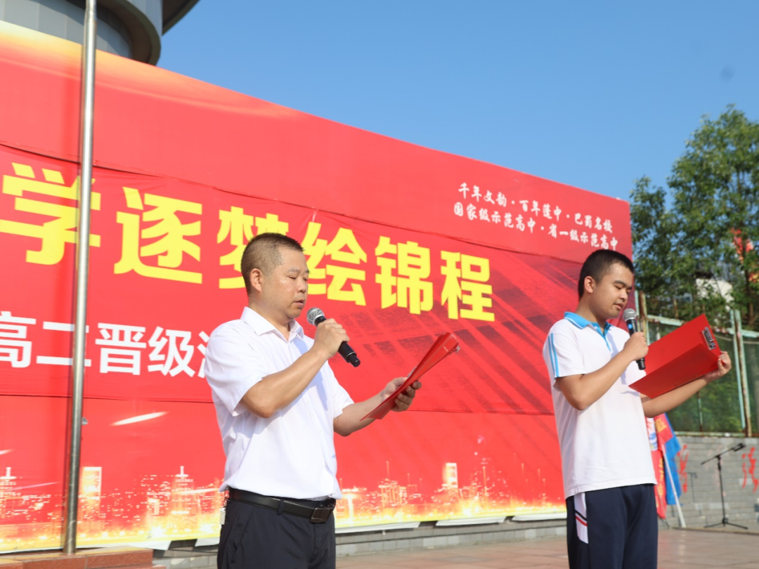 7月15日清晨,蓬溪中学操场红旗猎猎。千余名师生迎着朝阳肃立,在《义勇军进行曲》中凝望五星红旗冉冉升起。一场以 “扬帆奋楫开新境,笃学逐梦绘锦程” 为主题的高一升高二晋级仪式,在校长杨加林的宣布中正式拉开战幕。