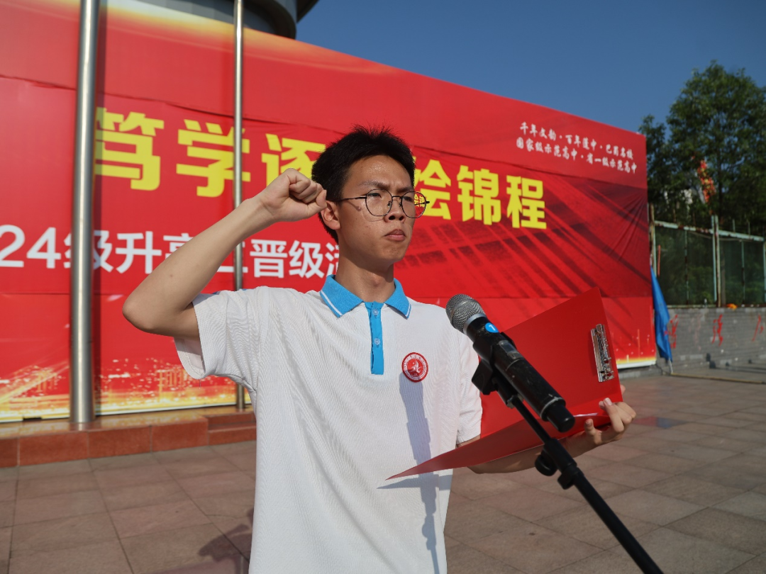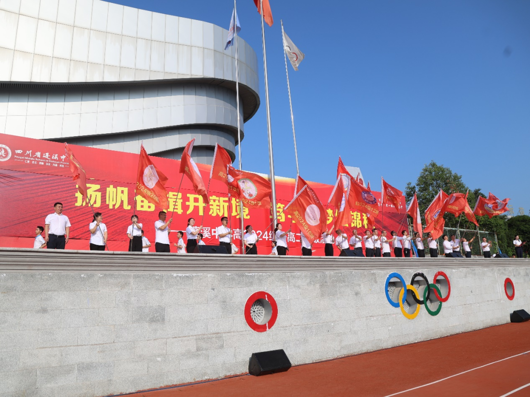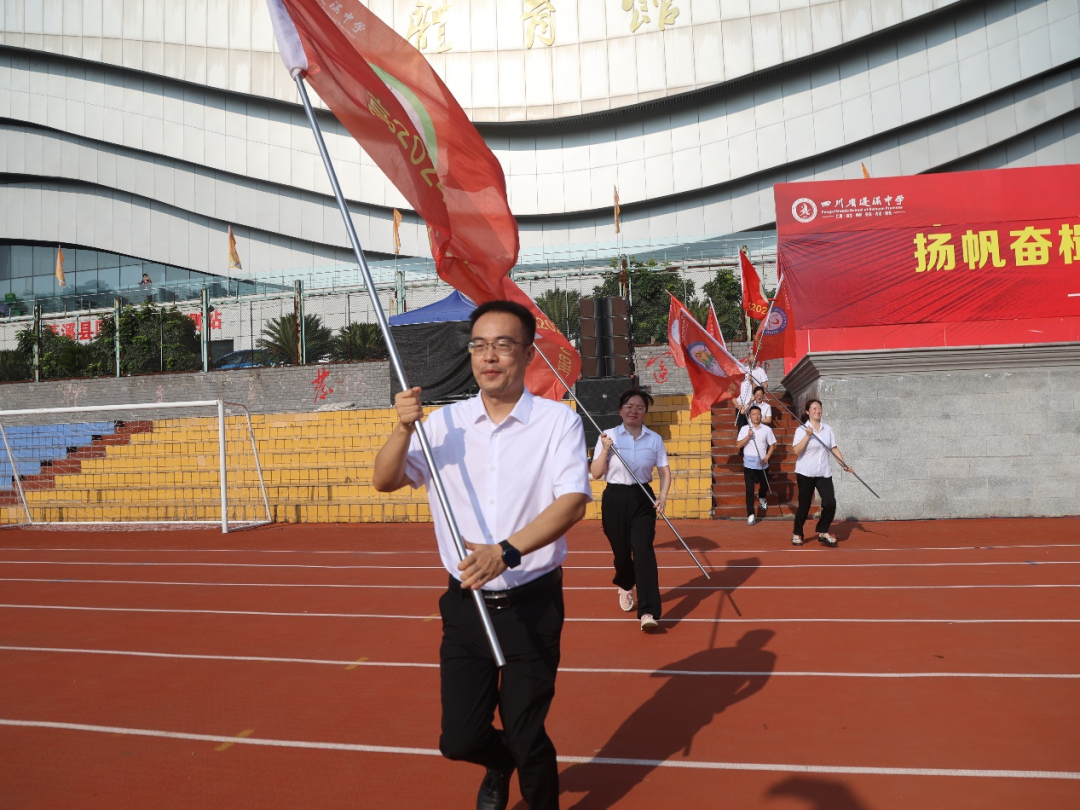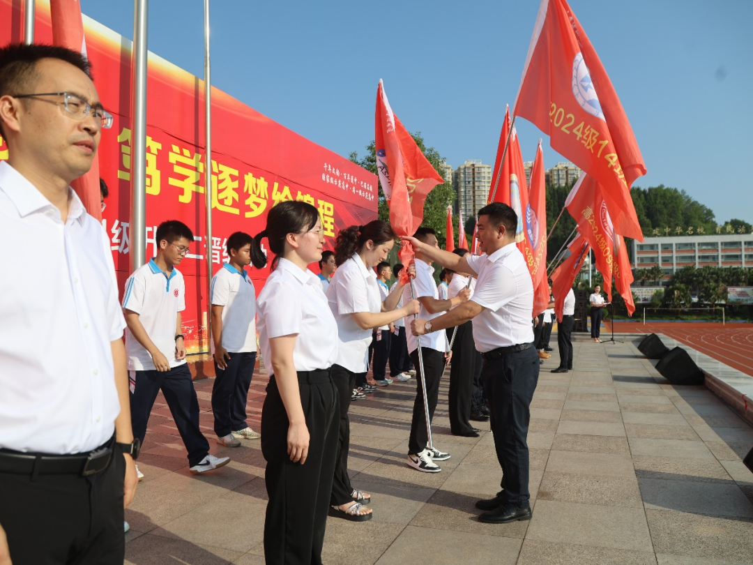 在雷鸣般的掌声中,学校党委书记胥杰将鲜红的级旗郑重交到校长、高2024级分管领导杨加林手中。随后,21面班旗如火焰般在主席台次第展开,班主任们接过旗帜奋力挥动,全场瞬间沸腾。“坚守梦想,不忘初心!勤学苦读,严格自律!”领誓人王镇奥的呐喊引爆千人宣誓,三声 “我行!我行!我行!” 响彻云霄。各班高举班旗绕操场奔跑,口号声此起彼伏,跑道化作奔腾的青春河流。