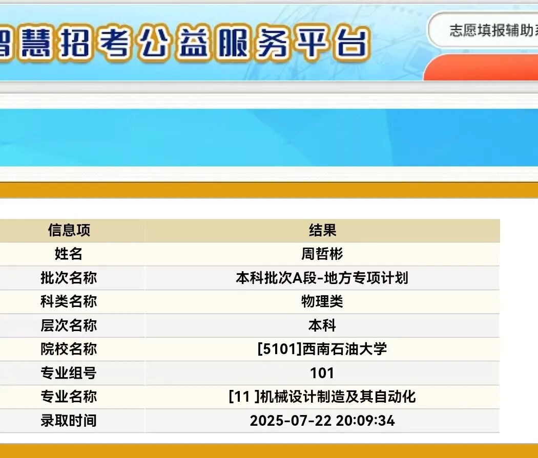周哲彬,西南石油大学(地方专项计划)机械设计制造及其自动化专业